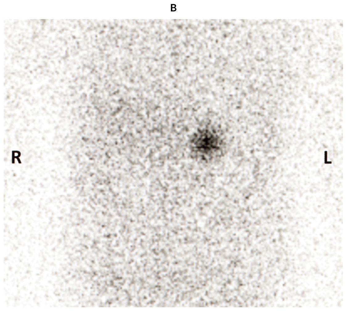 48歳の女性。人間ドックで副腎腫瘤を指摘され来院した。数年前から高血圧症に対してカルシウム拮抗薬とアンジオテンシンⅡ受容体拮抗薬を内服中である。身長160cm,体重66kg。脈拍72/分,整。血圧130/84mmHg。満月様顔貌および水牛様肩がみられる。血液生化学所見:空腹時血糖110mg/dL,HbA1c 6.2%(基準4.9~6.0),トリグリセリド154mg/dL,LDLコレステロール182mg/dL,Na 142mEq/L,K 3.8mEq/L,Cl 104 mEq/L,血漿レニン活性1.6ng/mL/時間(基準1.2~2.5),アルドステロン48pg/mL(基準4~82),ACTH 1.4pg/mL(基準60以下),コルチゾール24.2μg/dL(基準5.2~12.6),アドレナリン8pg/mL(基準100以下),ノルアドレナリン124pg/mL(基準100~450)。少量デキサメタゾン(1mg)抑制試験は陽性であった。腹部単純CT(A)と副腎皮質シンチグラム(B)を下に示す。治療として副腎腫瘤の摘出手術を予定している。
