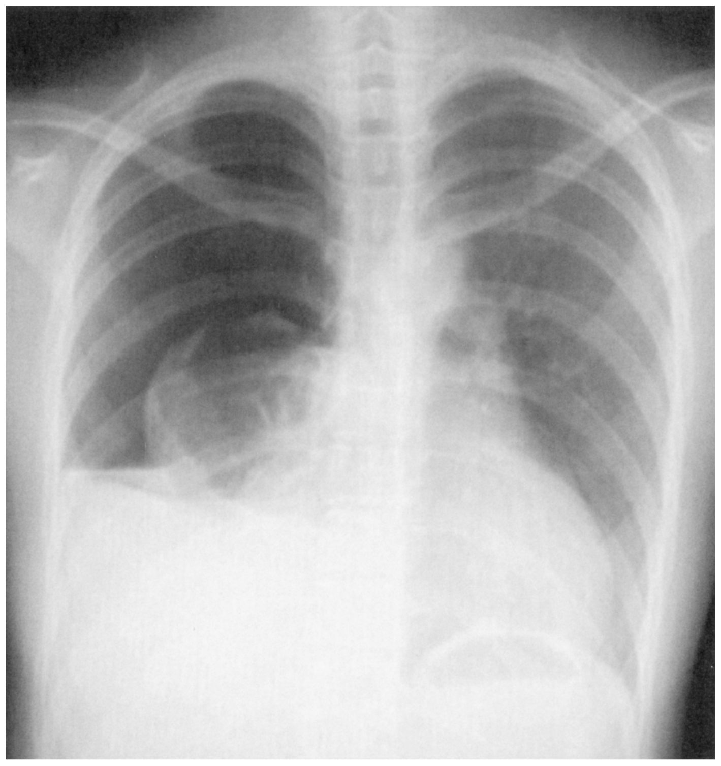 20歳の女性。胸痛と息苦しさとを主訴に救急車で搬入された。1時間前,咳をした後に右胸痛と呼吸困難が出現し,次第に増悪したため救急車を要請した。身長162cm,体重48kg。体温36.5℃。心拍数108/分,整。血圧84/48mmHg。呼吸数18/分。SpO2 95%(リザーバー付マスク10L/分 酸素投与下)。眼瞼結膜は貧血様である。心音に異常を認めない。呼吸音は右で減弱している。血液所見:赤血球290万,Hb 9.5g/dL,Ht 29%,白血球10,690,血小板19万。胸部エックス線写真を下に示す。輸液を開始し胸腔ドレナージを施行したところ,血性排液1,200mLがあり持続的に空気漏れがみられた。ドレナージ2時間後,胸腔ドレナージ排液は血性で1時間200mLの排液と空気漏れが持続しており,SpO2 99%(マスク8L/分 酸素投与下)であった。この時点で末梢血液所見は赤血球245万,Hb 7.5g/dL,Ht 24%,白血球12,600,血小板18万であった。心拍数120/分,整。血圧70/40mmHgで赤血球輸血を開始した。