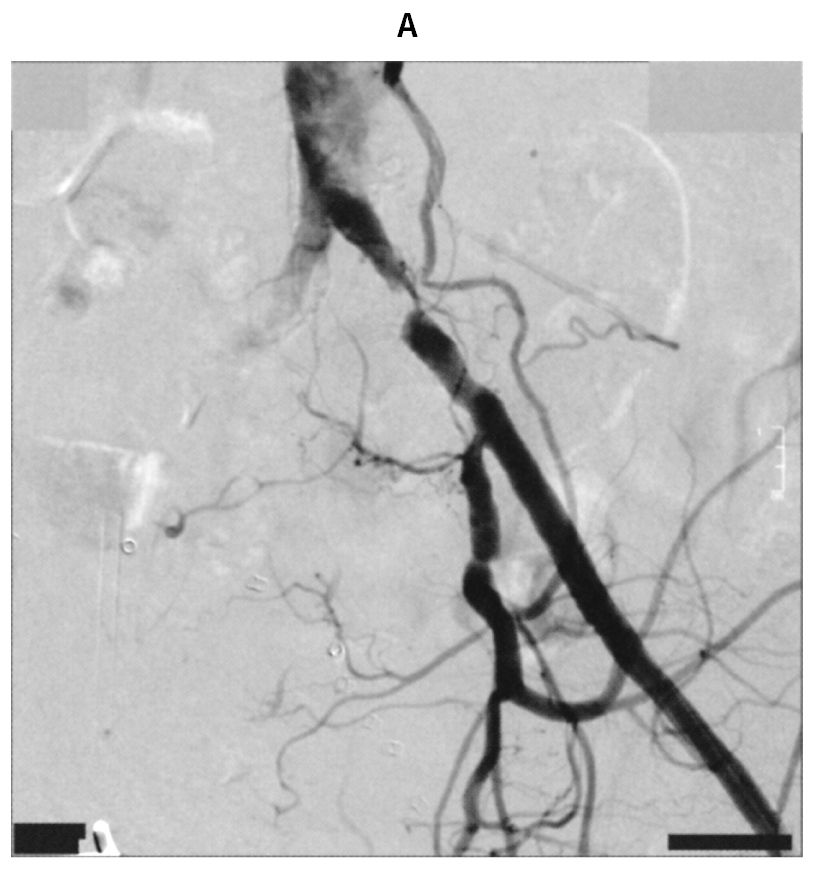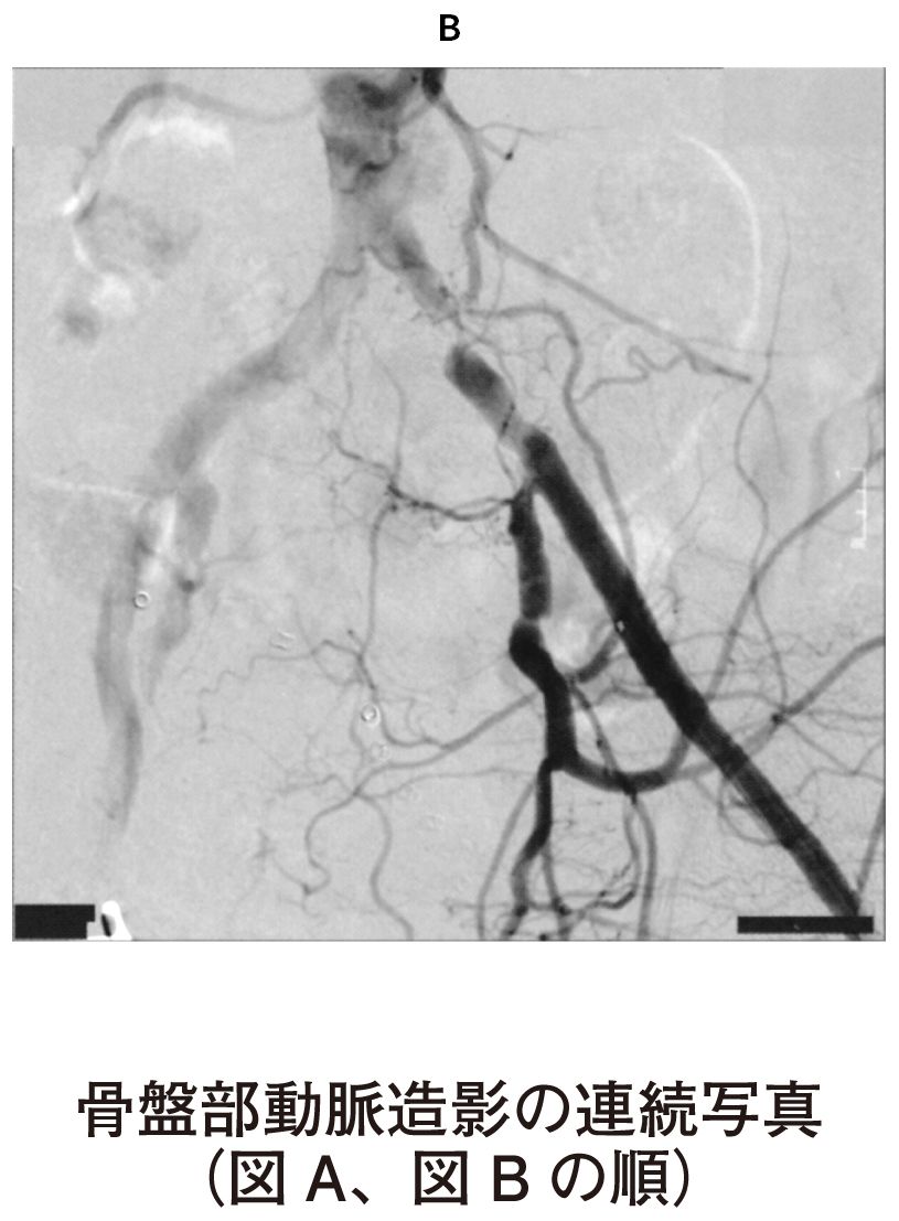 78歳の男性。歩行時の左下肢疼痛を主訴に来院した。4か月前から約300mの歩行で左下肢の痛みを自覚するようになり,立ち止まって休憩すると消失していた。最近痛みのため徐々に歩行可能距離が短くなった。60歳時から糖尿病と脂質異常症に対して定期的な投薬治療が行われている。喫煙は20歳から60歳まで20本/日。飲酒は機会飲酒。意識は清明。身長168cm,体重65kg。体温36.2℃。脈拍80/分,整。右上肢血圧160/90mmHg。呼吸数20/分。SpO2 96%(room air)。足関節上腕血圧比〈ABI〉は右側で0.96,左側で0.68であった。左大腿動脈から逆行性に造影した骨盤部の動脈造影の連続写真(A)(B)を下に示す。