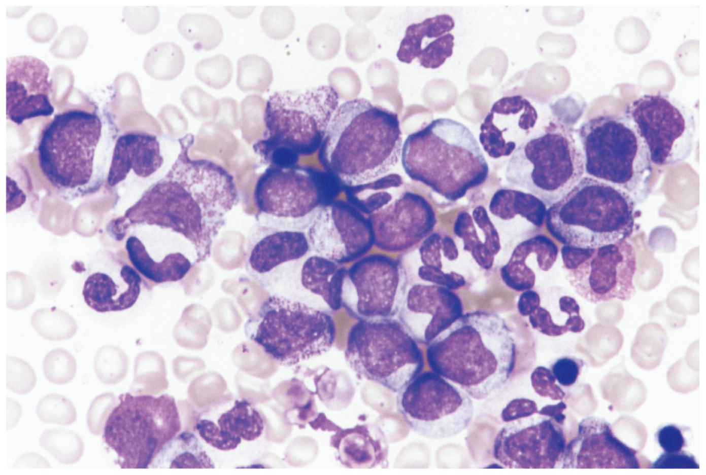 60歳の男性。白血球増多を主訴に来院した。健康診断で白血球数増多を指摘され,紹介受診した。自覚症状はない。体温36.3℃。眼瞼結膜に貧血を認めず,体表リンパ節を触知しない。心音と呼吸音とに異常を認めない。腹部は平坦,軟で,肝を触知しない。左肋骨弓下に脾を4cm触知する。血液所見:赤血球480万,Hb 14.4g/dL,Ht 46%,白血球31,200(骨髄球5%,後骨髄球1%,桿状核好中球2%,分葉核好中球54%,好酸球5%,好塩基球7%,単球6%,リンパ球20%),血小板62万。血液生化学所見:総蛋白7.0g/dL,アルブミン4.1g/dL,IgG 1,041mg/dL(基準861~1,747),IgA 297mg/dL(基準93~393),IgM 80mg/dL(基準33~183),総ビリルビン0.4mg/dL,AST 23U/L,ALT 18U/L,LD 445U/L(基準124~222),ALP 74U/L(基準38~113),尿素窒素21mg/dL,クレアチニン0.8mg/dL,尿酸5.8 mg/dL,血糖94mg/dL,Ca 9.5mg/dL。骨髄塗抹Wright-Giemsa染色標本を下に示す。