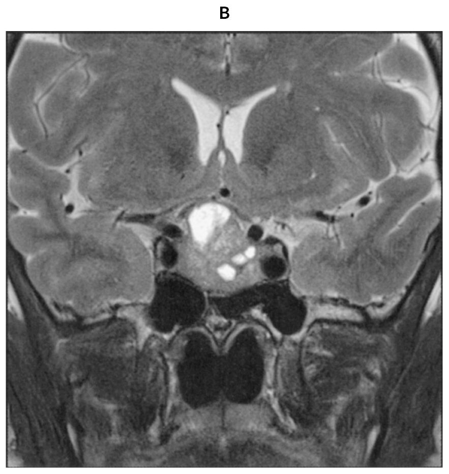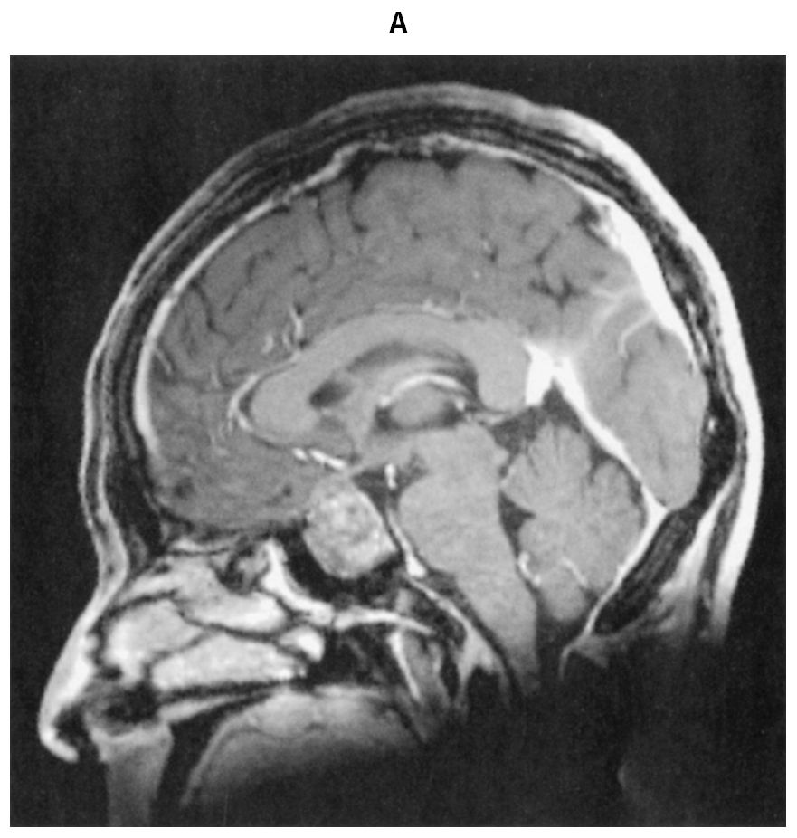 54歳の男性。口腔内の違和感を主訴に来院した。2年前から口唇の肥厚と下顎の突出を自覚し,その後,靴のサイズが約1cm大きくなり,指輪が外れなくなった。既往歴に高血圧症があり内服治療中である。また,睡眠時無呼吸症候群で通院中である。意識は清明。身長162cm,体重72kg。体温36.5℃。脈拍96/分,整。血圧120/90mmHg。矯正視力は右1.5左0.2。顔面は,眉弓突出,口唇肥大および下顎突出を認め,口腔内は舌の腫大を認める。血液所見:赤血球366万,白血球4,200,血小板20万。血液生化学所見:総蛋白7.6g/dL,アルブミン4.4g/dL,総ビリルビン0.6mg/dL,AST 18U/L,ALT 15U/L,尿素窒素22mg/dL,クレアチニン0.7mg/dL,空腹時血糖111mg/dL,HbA1c 6.3%(基準4.9~6.0),Na 140mEq/L,K 4.1mEq/L,Cl 104mEq/L。頭部造影MRIのT1強調矢状断像(A)と頭部単純MRIのT2強調冠状断像(B)とを下に示す。