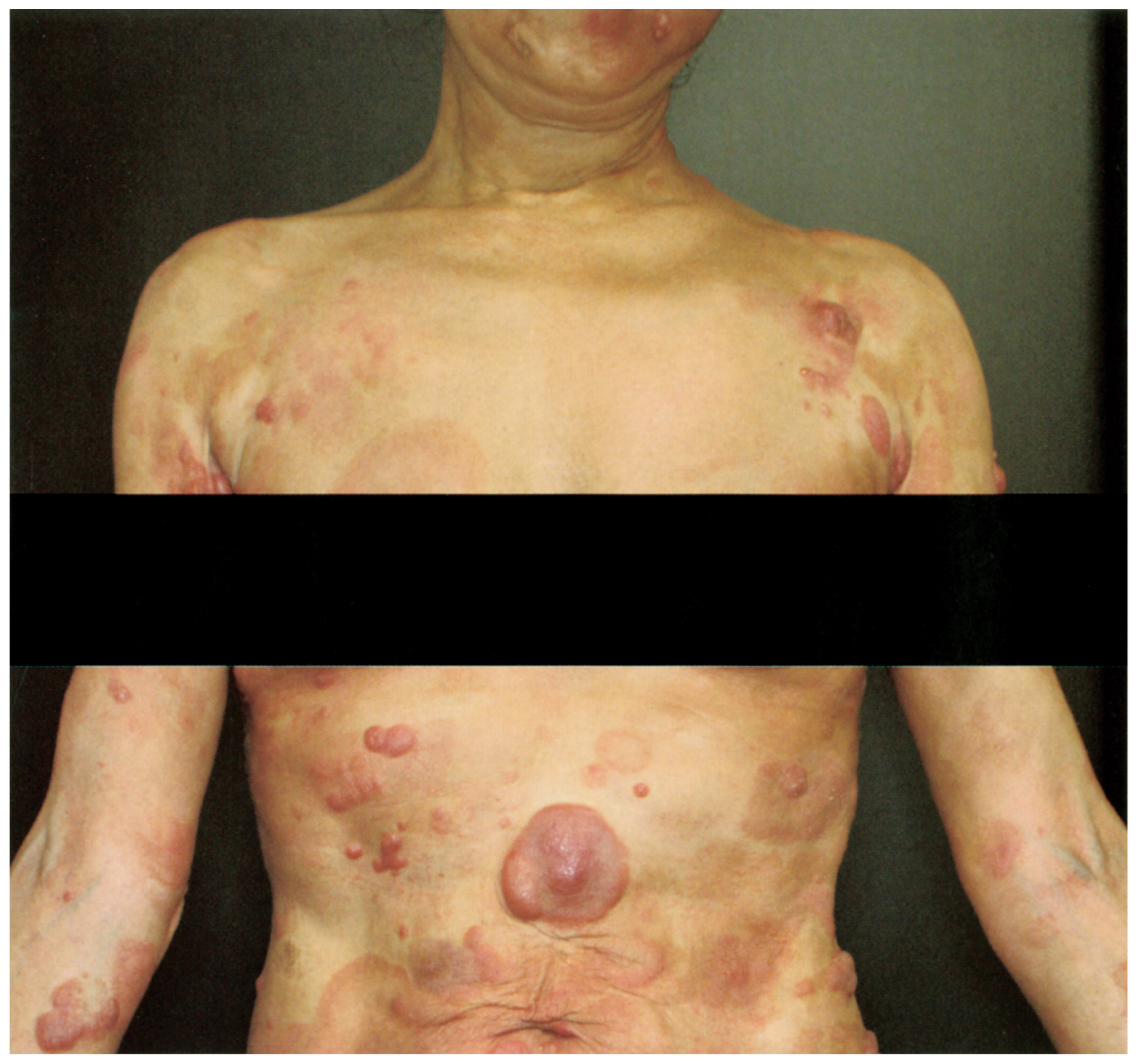 63歳の女性。全身の皮疹を主訴に来院した。約15年前から体幹を中心に瘙痒を伴う紅斑が出現し,近くの診療所で湿疹として副腎皮質ステロイド外用薬による治療を受けていたが,改善と増悪を繰り返していた。約5年前から紅斑の一部が盛り上がり,局面を形成するようになった。6か月前から局面の一部が急速に増大し,腫瘤が複数出現した。腫瘤からの出血や悪臭も伴うようになった。顔面,体幹および四肢に径1~8cmの半球状~茸状に隆起する暗紅色の結節と腫瘤を複数認める。周囲には浸潤を触れる紅斑や局面が散在する。鼠径リンパ節に軽度の腫大を認める。血液所見:末梢血白血球数8,000/μL,異型リンパ球は認めない。LD 350U/L(基準124~222)。胸腹部造影CTでは両側鼠径リンパ節の軽度腫大以外に,内臓病変は指摘されなかった。腫瘤部からの皮膚生検の病理検査では,真皮に大型で核形不整な異型リンパ球が密に浸潤していた。表皮への浸潤は一部で認められた。皮疹の写真を下に示す。
