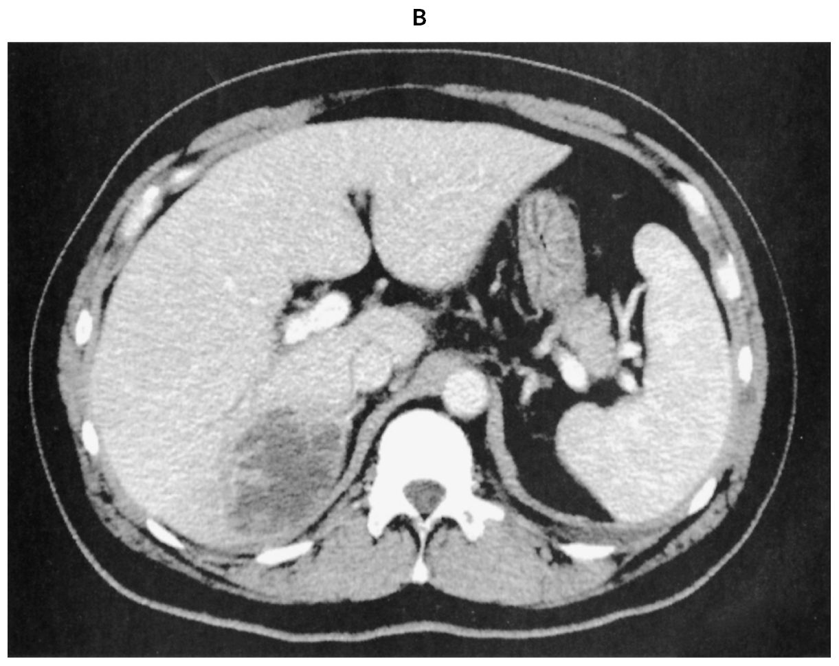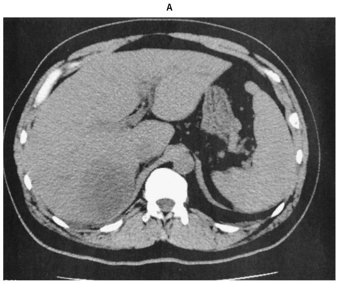 48歳の男性。悪寒と発熱を主訴に来院した。5日前から夕方になると38℃前後の発熱を生じ,軟便が続いていた。本日,悪寒を伴う発熱と両眼の視力低下を認めたため受診した。糖尿病で投薬治療中である。意識は清明。体温38.5℃。脈拍96/分,整。血圧140/74mmHg。呼吸数24/分。SpO2 97%(room air)。眼瞼結膜に異常を認めないが,両側の眼球結膜に充血を認める。頸部リンパ節を触知しない。心音と呼吸音とに異常を認めない。腹部は平坦で,右上腹部に圧痛を認める。右肋骨弓下に肝を3cm触知する。筋性防御と反跳痛は認めない。尿所見:蛋白(-),糖3+,ケトン体(-),潜血(-),沈渣に異常を認めない。血液所見:赤血球450万,Hb 14.0g/dL,Ht 45%,白血球14,600(桿状核好中球30%,分葉核好中球51%,好酸球1%,好塩基球1%,単球5%,リンパ球12%),血小板21万。血液生化学所見:総蛋白7.0g/dL,アルブミン3.5g/dL,総ビリルビン2.0mg/dL,直接ビリルビン1.5mg/dL,AST 35U/L,ALT 35U/L,LD 259U/L(基準124~222),ALP 220U/L(基準38~113),γ-GT 132U/L(基準13~64),アミラーゼ45U/L(基準44~132),CK 157U/L(基準59~248),尿素窒素19mg/dL,クレアチニン1.0mg/dL,尿酸7.2mg/dL,血糖198mg/dL,HbA1c 6.3%(基準4.9~6.0)。CRP 21mg/dL。胸部エックス線写真に異常を認めない。腹部単純CT(A)と腹部造影CT(B)とを下に示す。
