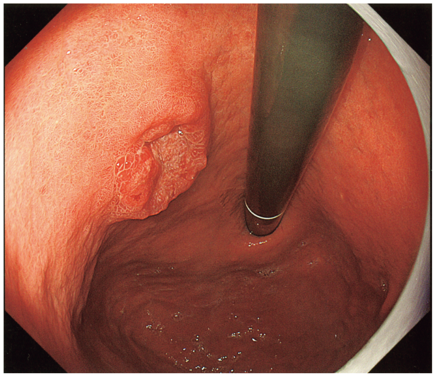 57歳の男性。心窩部痛を主訴に来院した。3か月前に食後の心窩部違和感が出現した。症状は徐々に増悪し,2週間前から心窩部痛を自覚したため受診した。既往歴と家族歴に特記すべきことはない。身長160cm,体重50kg。体温36.6℃。脈拍80/分,整。血圧138/78mmHg。眼瞼結膜と眼球結膜とに異常を認めない。頸部リンパ節を触知しない。心音と呼吸音とに異常を認めない。腹部は平坦,軟で,圧痛を認めない。腸雑音に異常を認めない。血液所見:赤血球484万,Hb 14.0g/dL,Ht 45%,白血球5,500,血小板22万。血液生化学所見:総蛋白6.7g/dL,アルブミン4.3g/dL,総ビリルビン0.7mg/dL,AST 13U/L,ALT 12U/L,LD 154U/L(基準124~222),ALP 73U/L(基準38~113),γ-GT 23U/L(基準13~64),尿素窒素19mg/dL,クレアチニン0.9mg/dL,尿酸6.4mg/dL,血糖98mg/dL,CEA 1.7ng/mL(基準5以下),CA19-9 2U/mL未満(基準37以下)。CRP 1.0mg/dL。上部消化管内視鏡検査の胃体上部像を下に示す。生検検体の病理検査で中分化管状腺癌と診断された。頸部~骨盤部造影CTでリンパ節腫大や遠隔転移を認めない。