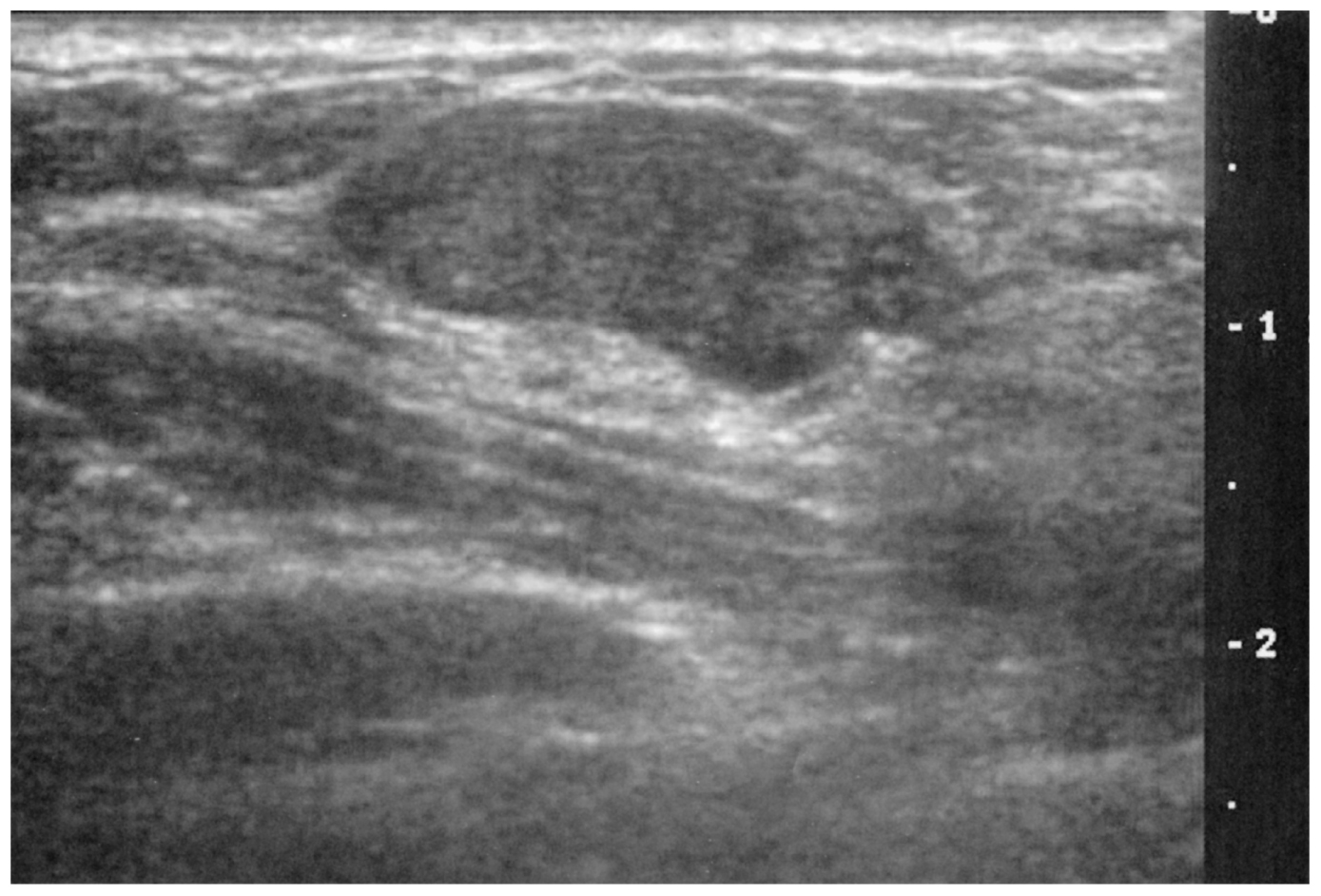22歳の女性。右乳房のしこりを主訴に来院した。右乳房に長径約2cmの卵形の腫瘤を触知する。腫瘤は表面平滑で弾性硬,可動性は良好で圧痛を認めない。乳頭からの分泌物を認めない。乳房超音波像を下に示す。