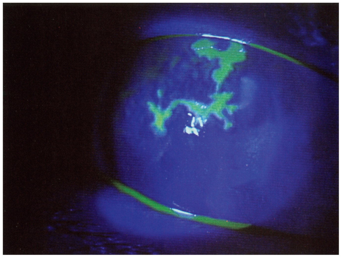 67歳の女性。数日前からの左眼視力低下と眼痛を主訴に来院した。左眼の矯正視力は0.6(矯正不能)。左眼のフルオレセイン染色後の細隙灯顕微鏡写真を下に示す。右眼に異常を認めない。
