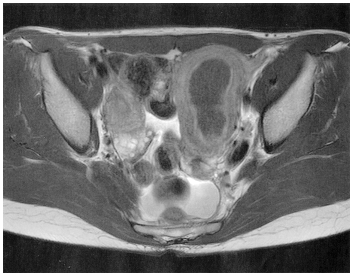 16歳の女子。毎月の月経時の強い下腹部痛を主訴に来院した。初経時より月経時の強い下腹部痛を自覚するようになった。月経時の下腹部痛が増強し,自宅近くの医療機関を受診したところ,左腎無形成と診断された。その後も毎月強い月経困難症が持続するため,紹介されて来院した。定期的な月経はあるが,毎回月経2~3日目に強い下腹部痛が出現し,鎮痛薬でも効果が乏しい。性交歴はない。初経は13歳。月経周期は28日型,整。経血量は正常範囲内である。体温36.0℃。脈拍88/分,整。血圧114/72mmHg。左下腹部に径10cmの腫瘤を触知し,付属器は触知しない。同部に圧痛を認める。骨盤部単純MRIのT2強調像を下に示す。