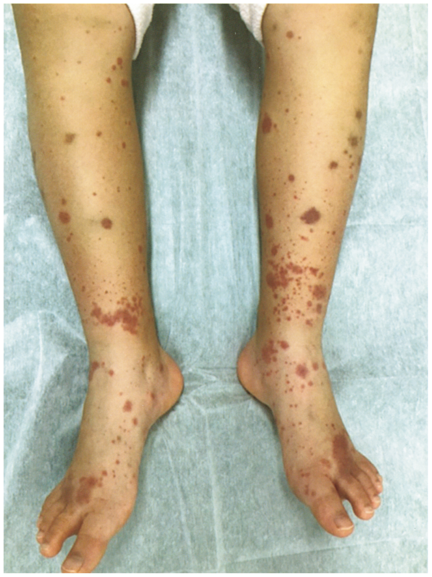 4歳の女児。皮疹,両足関節の痛み及び腹痛を主訴に父親に連れられて来院した。1週間前に発熱と咽頭痛が出現し,自宅近くの診療所を受診した。2日前から発疹と両足関節の痛みが出現した。今朝から腹痛を訴えているため受診した。体温36.9℃。脈拍68/分,整。眼瞼結膜と眼球結膜とに異常を認めない。咽頭に発赤を認めない。扁桃に腫大を認めない。頸部リンパ節を触知しない。心音と呼吸音とに異常を認めない。腹部は平坦,軟で,臍周囲に圧痛を認める。尿所見:蛋白(-),糖(-),潜血(-),沈渣に白血球を認めない。血液所見:赤血球466万,Hb 12.1g/dL,Ht 39%,白血球8,900(好中球62%,単球8%,リンパ球30%),血小板37万,PT-INR 1.0(基準0.9~1.1),APTT 29.0秒(基準対照32.2)。CRP 0.2mg/dL。下腿の写真を下に示す。