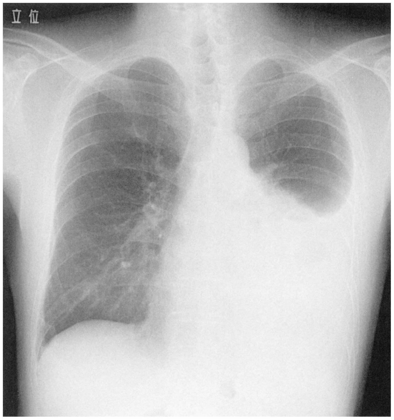73歳の男性。胸痛,発熱および呼吸困難を主訴に来院した。3日前から咳,倦怠感,胸痛および発熱が出現した。今朝から胸痛が悪化し,呼吸困難も出現したため受診した。痛みは左側胸部から背部に自覚し,咳や深呼吸で増悪する。意識は清明。体温38.5℃。脈拍108/分,整。血圧132/68mmHg。呼吸数24/分。SpO2 92%(room air)。心音に異常を認めない。左下肺野の聴診で呼吸音は減弱し,打診で濁音を認める。腹部は平坦,軟で,肝・脾を触知しない。下肢に浮腫は認めない。心電図に異常を認めない。胸部エックス線写真を下に示す。