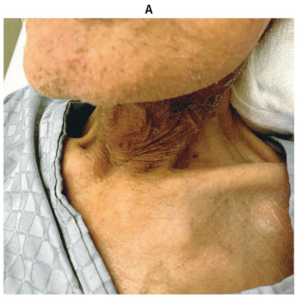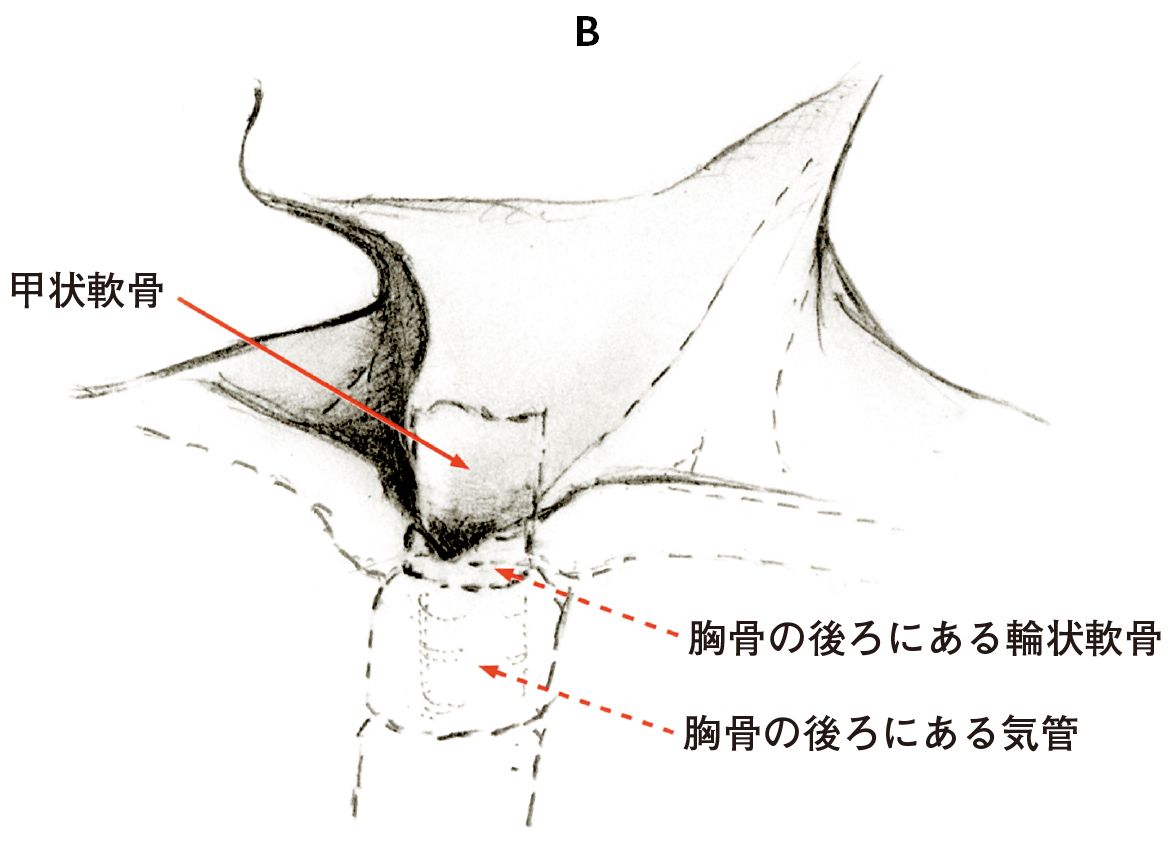 現 症:意識は清明。身長168cm,体重60kg。体温38.8℃。脈拍132/分,整。血圧146/78 mmHg。呼吸数28/分。SpO2 86%(room air)。眼瞼結膜と眼球結膜とに異常を認めない。咽頭に発赤や白苔を認めない。心音に異常を認めない。呼吸音は両側wheezesがあり,呼気が延長している。腹部は平坦,軟で,肝・脾を触知しない。四肢は浮腫を認めない。頸部の写真(A)と模式図(B)を下に示す。