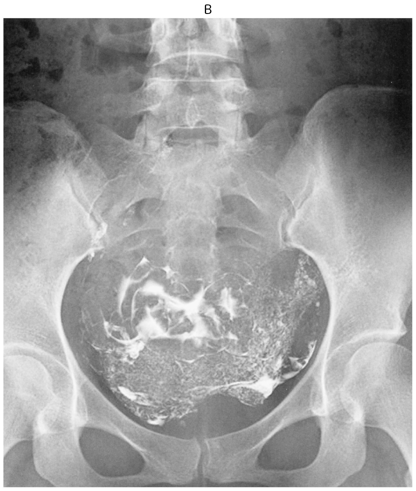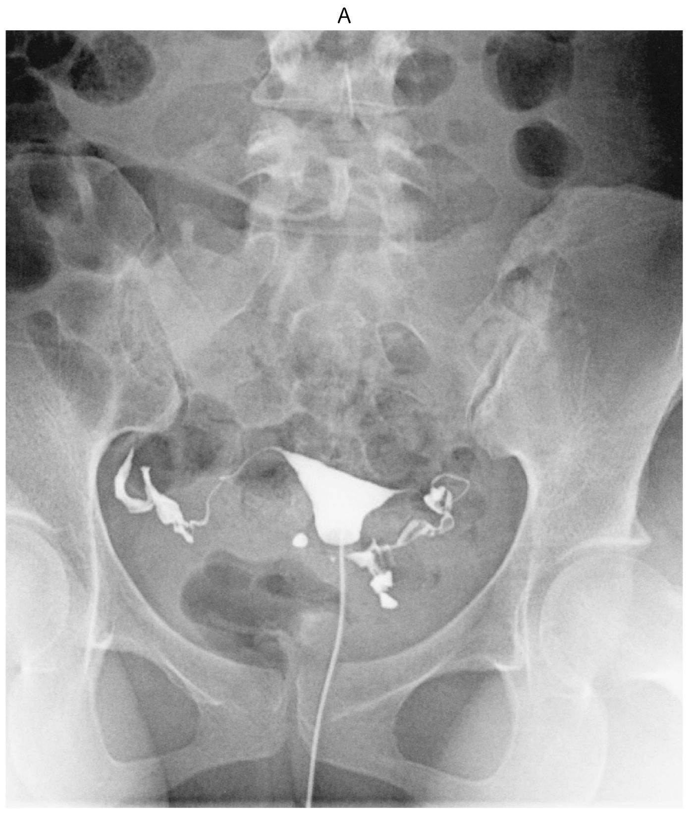 35歳の女性(0妊0産)。挙児を希望して来院した。1年前に結婚してから避妊はしておらず,1か月に1回程度の性交があり,軽度の性交痛がある。初経12歳。月経周期は30~40日型,整,持続6日間。月経痛は認めない。基礎体温は2相性である。身長162cm,体重55kg。内診で子宮は正常大で,両側付属器は触知しない。血液生化学所見(月経3日目):LH 5.2mIU/mL(基準1.8~7.6),FSH 8.2mIU/mL(基準5.2~14.4),プロラクチン〈PRL〉8.6ng/mL(基準15以下),エストラジオール42pg/mL(基準25~75),テストステロン60ng/dL(基準30~90)。夫の精液検査は正常である。子宮卵管造影像(A)(B)を下に示す。