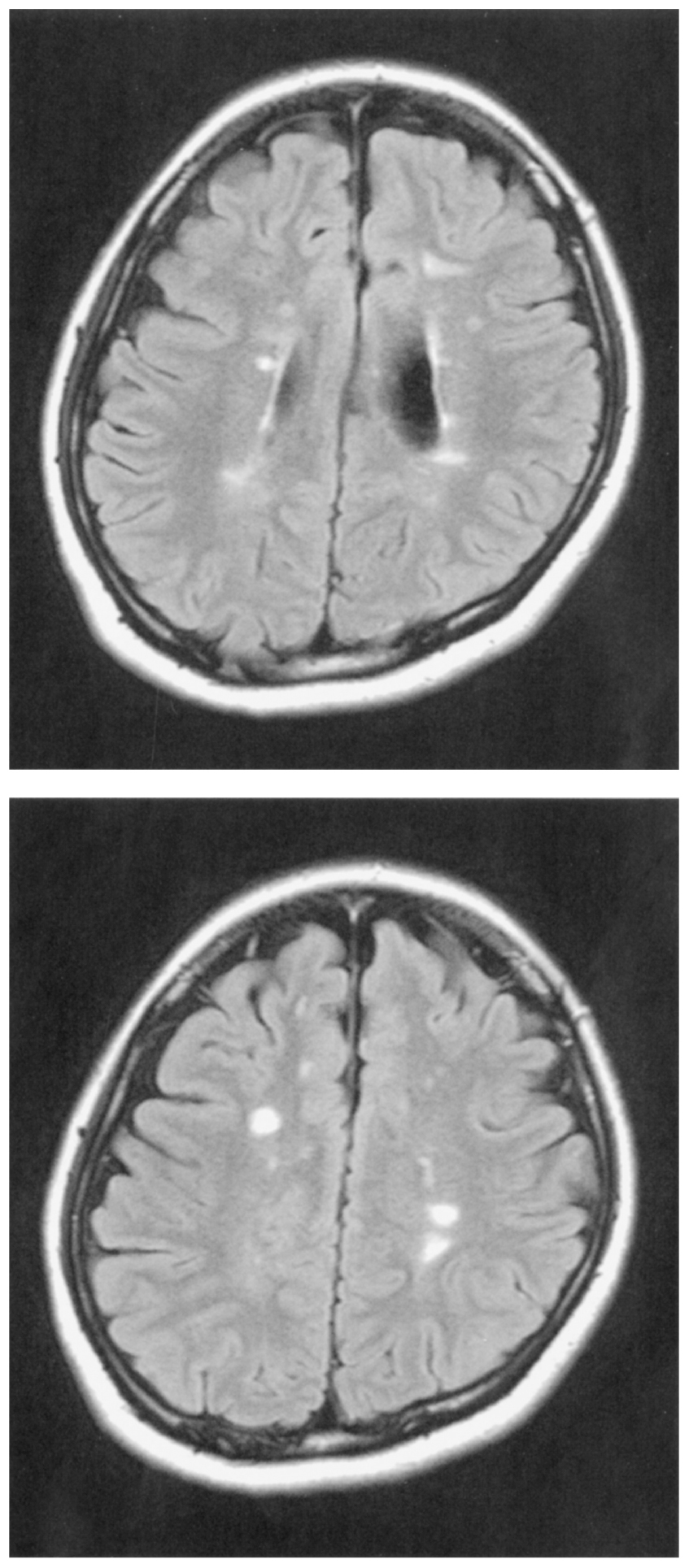 頭部単純MRIのFLAIR像を下に示す。同時に行われた頭部造影MRIでは異常な造影効果を認めた。
