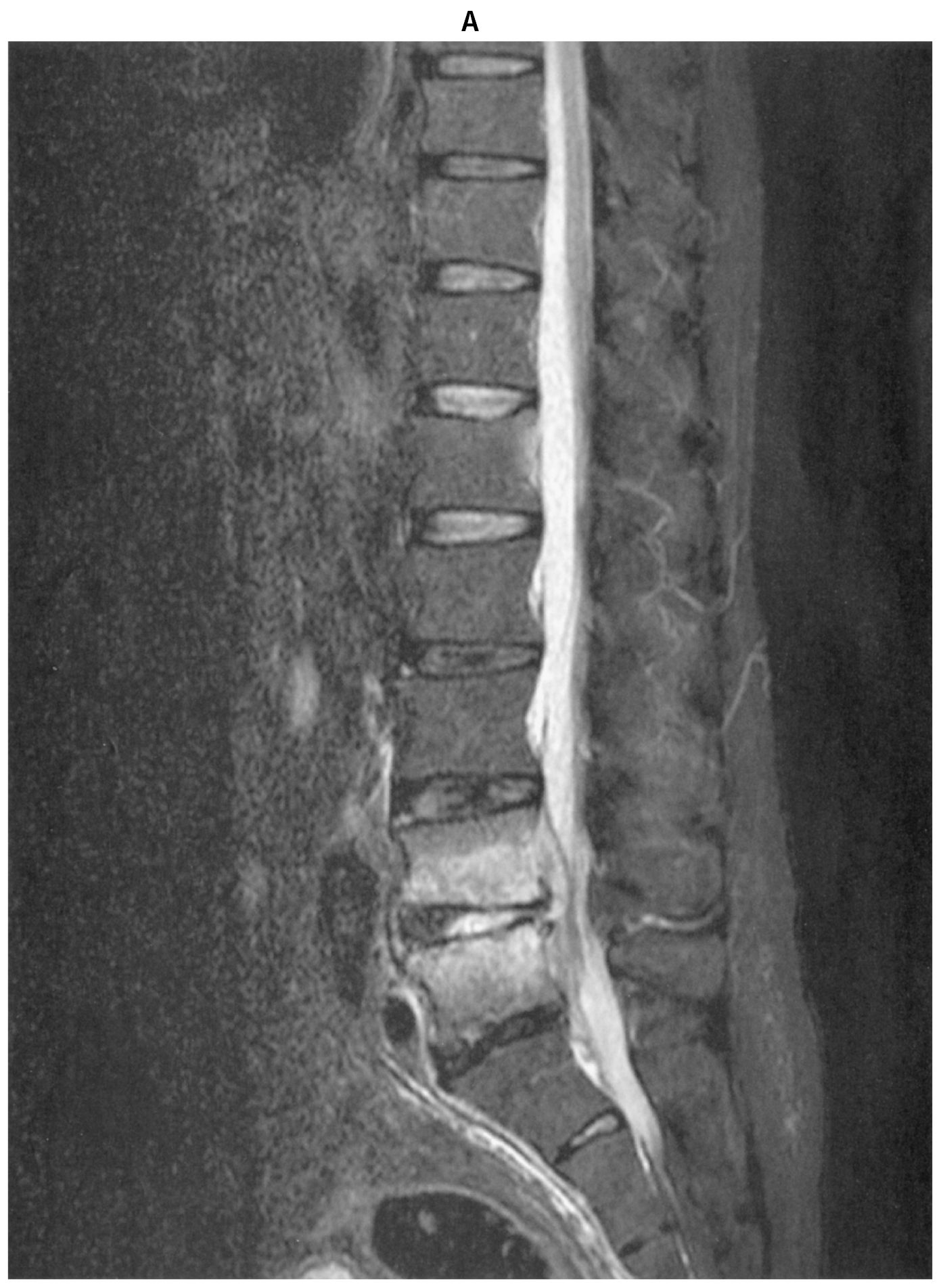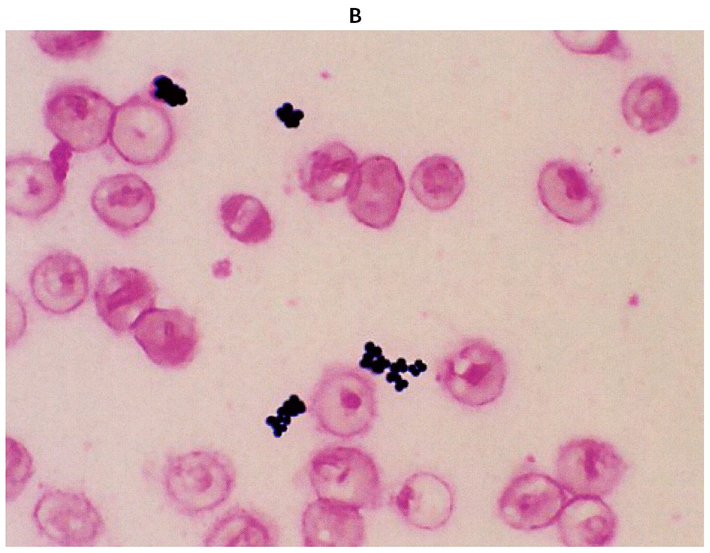 検査所見:血液所見:赤血球340万,Hb 12.4g/dL,Ht 37%,白血球11,100(好中球88%,好酸球1%,好塩基球1%,単球3%,リンパ球7%),血小板23万。血液生化学所見:総蛋白5.9g/dL,アルブミン2.6g/dL,総ビリルビン0.4mg/dL,AST 15U/L,ALT 11U/L,ALP 82U/L(基準38~113),γ-GT 11U/L(基準13~64),CK 50U/L(基準59~248),尿素窒素40mg/dL,クレアチニン3.7mg/dL,尿酸2.2mg/dL,血糖110mg/dL,HbA1c 5.8%(基準4.9~6.0),Na 143 mEq/L,K 3.5mEq/L,Cl 102mEq/L。CRP 14mg/dL。胸部エックス線写真で心胸郭比51%,両側肺野に浸潤影を認めない。腰椎単純MRIの脂肪抑制T2強調矢状断像(A)を下に示す。受診時に採取した血液培養が陽性となった。血液培養ボトル内容のGram染色標本(B)を下に示す。