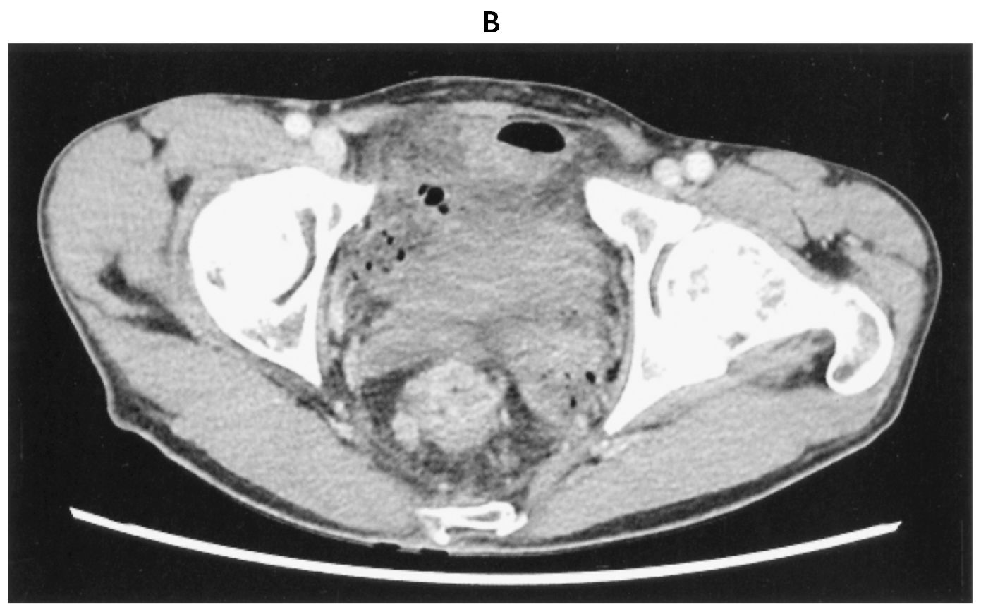 45歳の男性。下血を主訴に来院した。1か月前から排便時の出血を自覚していた。既往歴に特記すべきことはない。喫煙は20本/日を25年間。飲酒歴はない。意識は清明。身長170cm,体重54kg。体温36.4℃。脈拍68/分,整。血圧112/68mmHg。呼吸数12/分。SpO2 96%(room air)。眼瞼結膜と眼球結膜とに異常を認めない。心音と呼吸音とに異常を認めない。腹部は平坦,軟で,肝・脾を触知しない。血液所見:赤血球508万,Hb 15.2g/dL,Ht 45%,白血球6,400,血小板24万。血液生化学所見:総蛋白7.2g/dL,アルブミン4.8g/dL,総ビリルビン1.0mg/dL,直接ビリルビン0.2mg/dL,AST 18U/L,ALT 16U/L,LD 166U/L(基準124~222),ALP 63U/L(基準38~113),尿素窒素12mg/dL,クレアチニン0.8mg/dL,血糖92mg/dL,CEA 10.2ng/mL(基準5以下),CA19-9 32U/mL(基準37以下)。CRP 0.2mg/dL。下部消化管内視鏡検査の直腸像(A)と腹部造影CT(B)とを下に示す。その他画像検査で,遠隔転移は認めなかった。開腹手術を行うことにした。