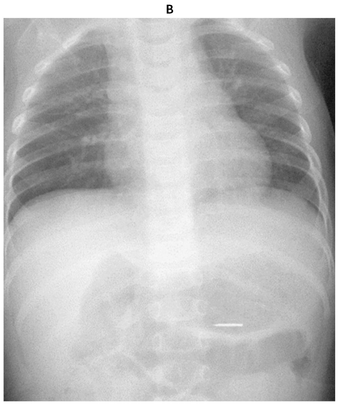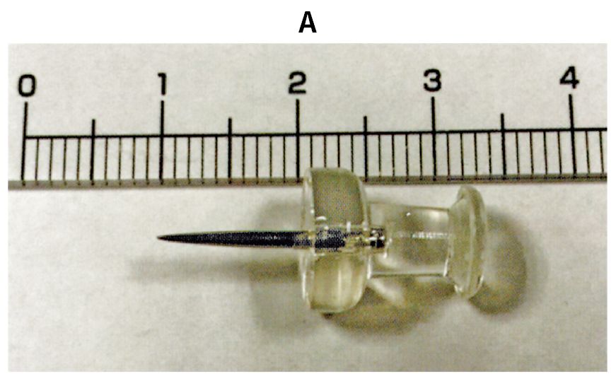 1歳3か月の女児。画鋲を誤飲したため救急車で搬入された。机の上に置いてあった画鋲を飲んだところを母親が目撃し,救急車を要請した。飲み込んだ画鋲と同じものを持参している。体温36.4℃。心拍数110/分,整。血圧84/50mmHg。呼吸数30/分。SpO2 98%(room air)。機嫌はよく,顔色は良好である。努力呼吸を認めず,呼吸音に異常を認めない。腹部を軽く触ると平坦で軟らかく,啼泣は認めない。持参した画鋲の写真(A)と来院時の胸腹部エックス線写真(B)を下に示す。