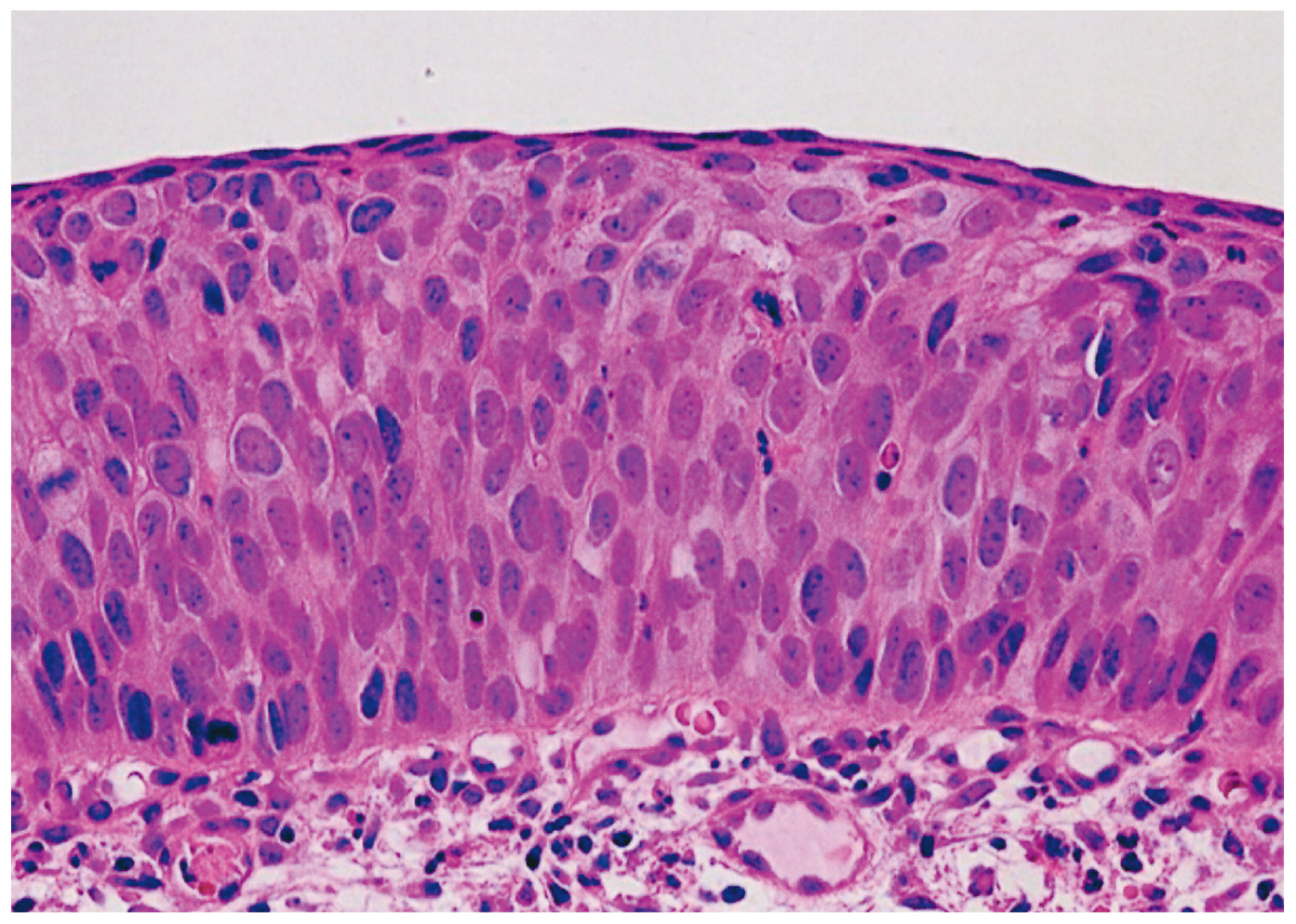 32歳の女性(0妊0産)。自宅近くの診療所で子宮頸がん検診を受けたところ,細胞診の異常を指摘されたため受診した。自覚症状はない。コルポスコピーで子宮頸部に異常所見があったため,狙い組織診を実施した。子宮頸部組織のH-E染色標本を下に示す。後日実施した骨盤部造影MRI及び胸腹部造影CTでは異常を認めなかった。