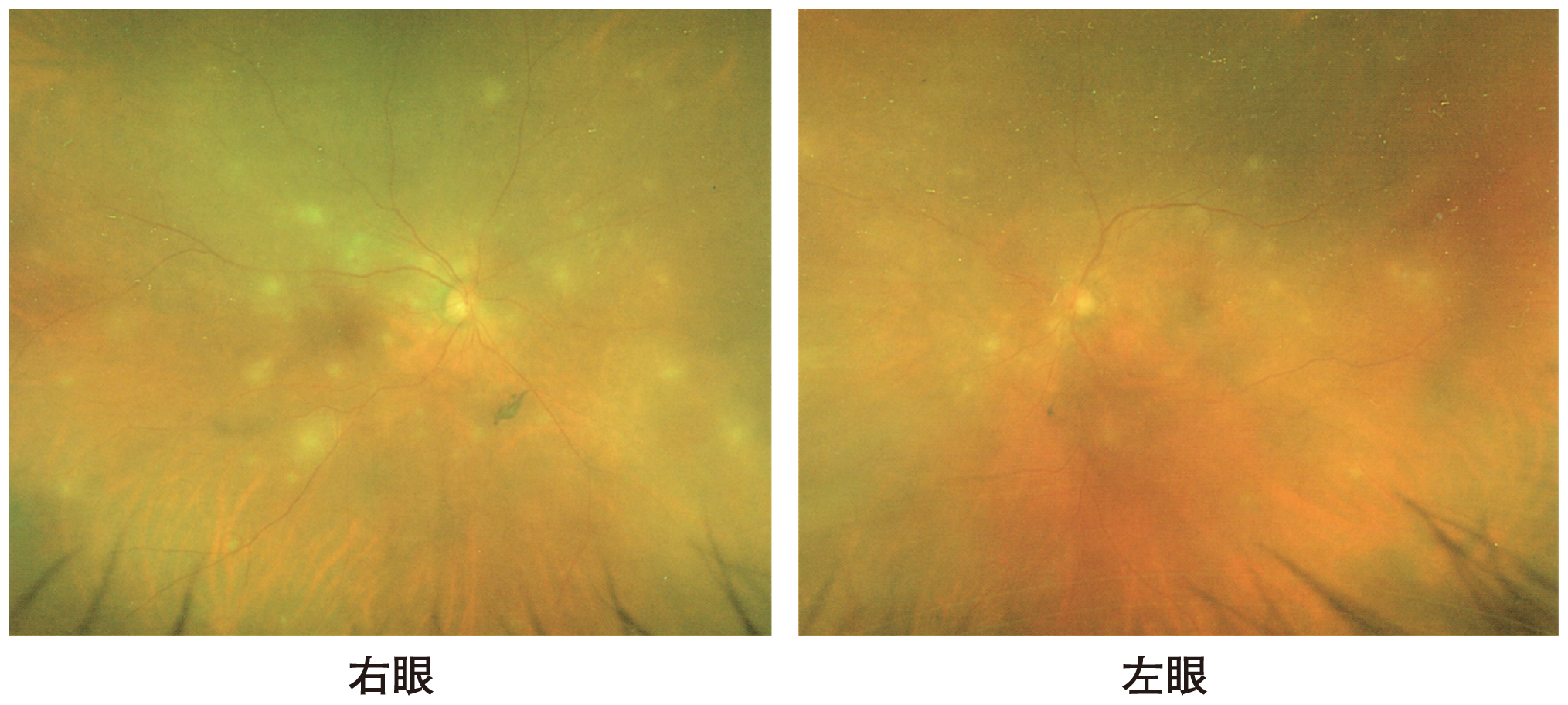 83歳の男性。発熱のため入院中である。短腸症候群で自宅近くの医療機関で中心静脈栄養を行われていた。39℃の発熱を認めたため,中心静脈カテーテルは抜去した。血液培養の結果はまだ出ておらず,抗菌薬の全身投与を2日間行っても,発熱は続いている。本日から両眼で飛蚊症を訴えている。両眼の眼底写真を下に示す。