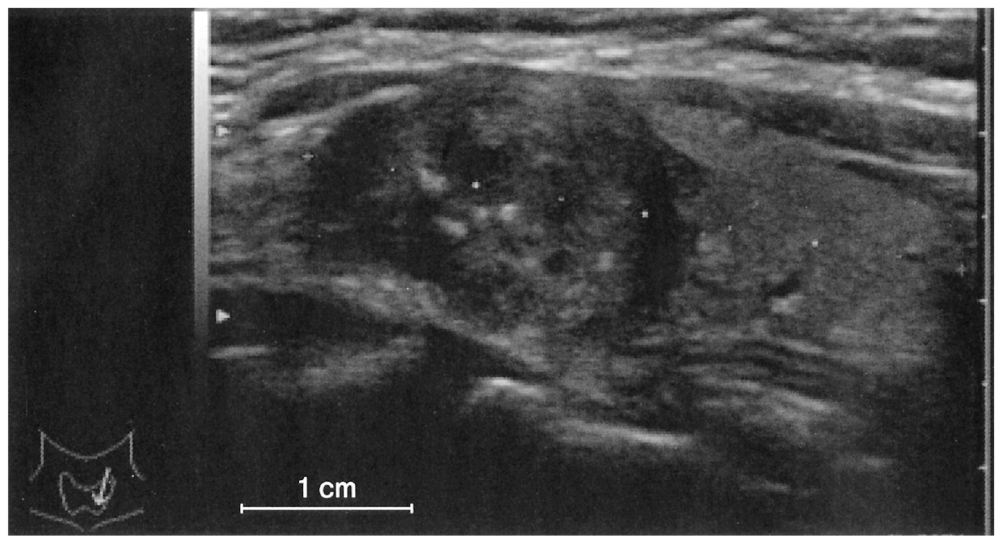35歳の女性。結節性甲状腺腫を指摘され来院した。身長164cm,体重45kg。脈拍72/分,整。血圧120/76mmHg。甲状腺左葉に小結節を触知し,圧痛を認めない。血液生化学所見:TSH 2.8μU/mL(基準0.2~4.0),FT3 3.4pg/mL(基準2.3~4.3),FT4 1.4ng/dL(基準0.8~2.2)。免疫血清学所見:抗サイログロブリン抗体0.3U/mL未満(基準0.3以下),抗甲状腺ペルオキシダーゼ〈TPO〉抗体0.3U/mL未満(基準0.3以下)。頸部超音波像を下に示す。