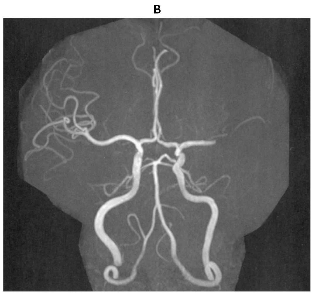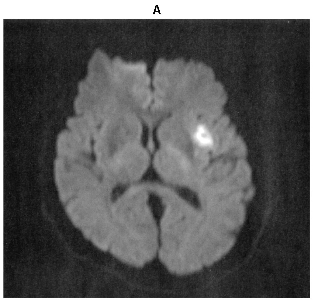70歳の男性。65歳時に発作性心房細動を指摘されていた。農作業中に吐血し,胃潰瘍穿孔のため,入院した。開腹手術を受け,経過良好のため,退院を予定していた。手術から5日後の午後1時に突然,言葉がしゃべれなくなった。その後,右半身の脱力が出現したため,午後1時25分に病棟看護師から研修医へ連絡があった。意識レベルはJCSⅠ-2。身長171cm,体重65kg。体温36.2℃。脈拍76/分,不整。血圧170/102mmHg。左共同偏視,運動失語,右片麻痺を認めている。NIHSS〈NIH stroke scale〉は16/42点であった。血液所見:赤血球368万,Hb 9.2g/dL,Ht 35%,白血球11,600,血小板16万。12誘導心電図で心房細動を認める。午後2時の頭部単純MRIの拡散強調像(A)と頭部MRA(B)とを下に示す。
