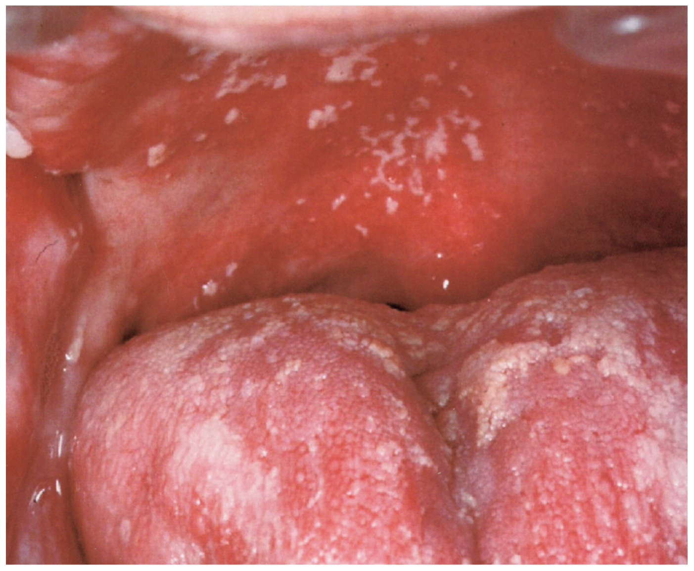 57歳の女性。口腔内の白色病変を主訴に来院した。約2週間前から,のどの違和感を自覚していたがそのままにしていた。昨日,鏡で見ると口蓋垂の周辺が点状に白くなっていることに気付いた。ざらざらとする違和感はあるが咽頭痛や発熱はない。約2年前から気管支喘息のため気管支拡張薬と副腎皮質ステロイド吸入薬を使用している。身長157cm,体重63kg。尿所見と血液所見とに異常を認めない。白色病変を綿棒でこすると,剥離可能である。口腔内の写真を下に示す。