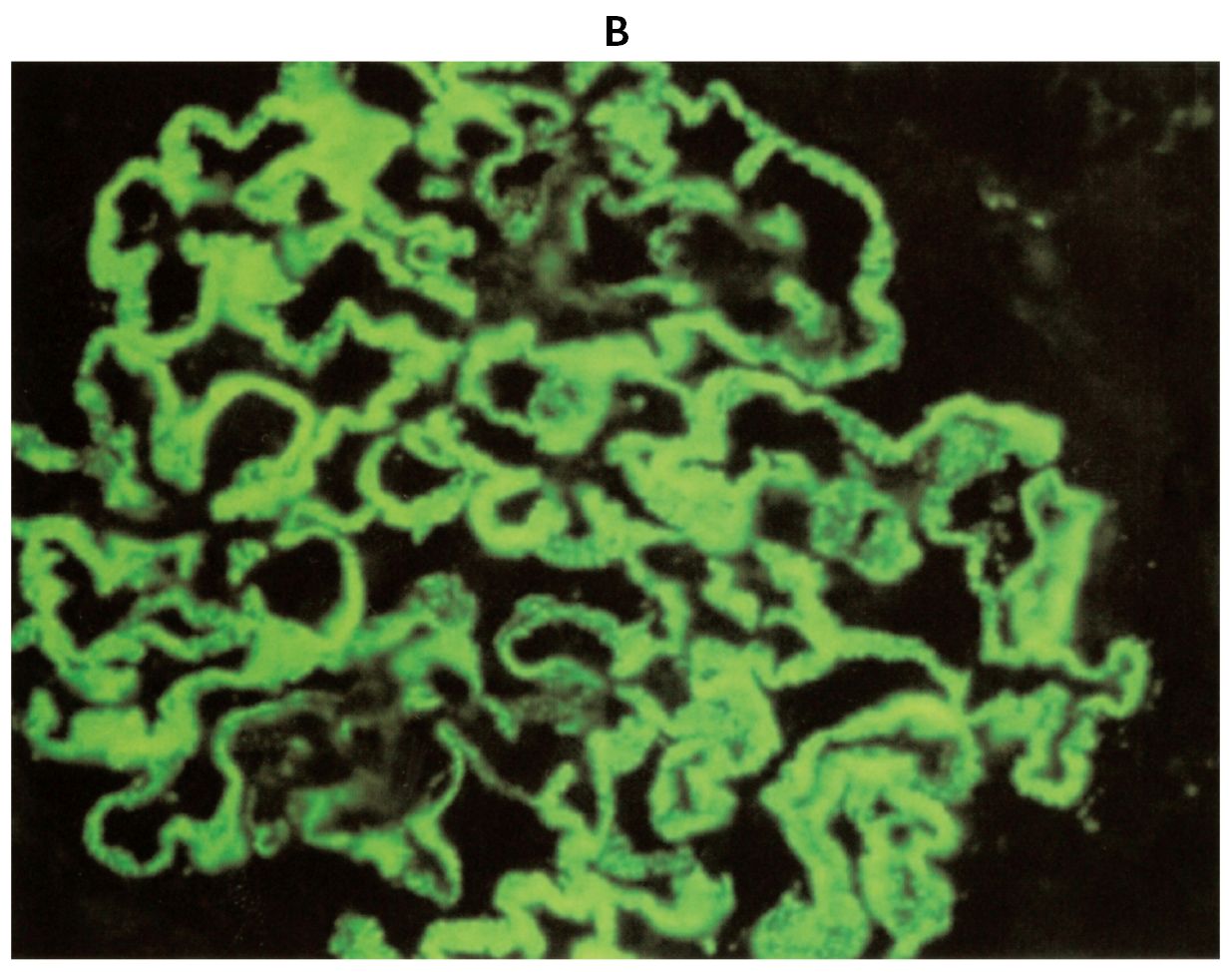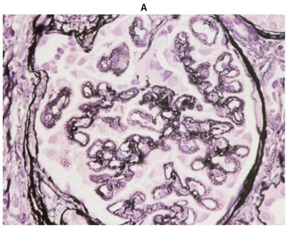 58歳の女性。下腿の浮腫を主訴に来院した。毎年職場健診を受診していたが,異常は指摘されなかった。6か月前の健診で初めて蛋白尿を指摘されたが,症状がないのでそのままにしていた。1か月前から両下腿の浮腫が出現し,次第に増悪したため受診した。身長160cm,体重60kg。脈拍64/分,整。血圧132/90mmHg。胸腹部に異常を認めない。両下腿に圧痕性浮腫を認める。皮膚に異常を認めない。尿所見:蛋白3+,糖(-),潜血(-),尿蛋白/Cr比2.5g/gCr(基準0.15未満),沈渣に赤血球0~2/HPF,白血球0~2/HPF,硝子円柱を少数認める。血液所見:赤血球460万,Hb 13.1g/dL,Ht 42%。血液生化学所見:総蛋白5.3g/dL,アルブミン2.6g/dL,IgG 1,100mg/dL(基準861~1,747),IgA 386mg/dL(基準93~393),IgM 188mg/dL(基準50~269),尿素窒素31mg/dL,クレアチニン1.3mg/dL,eGFR 33.5mL/分/1.73m2,尿酸7.0mg/dL,血糖102mg/dL,HbA1c 5.9%(基準4.9~6.0),LDLコレステロール213mg/dL。免疫血清学所見:CRP 0.1 mg/dL,抗核抗体20倍(基準20以下)。腎生検のPAM染色標本(A)と蛍光抗体IgG染色標本(B)とを下に示す。Congo-Red染色は陰性である。
