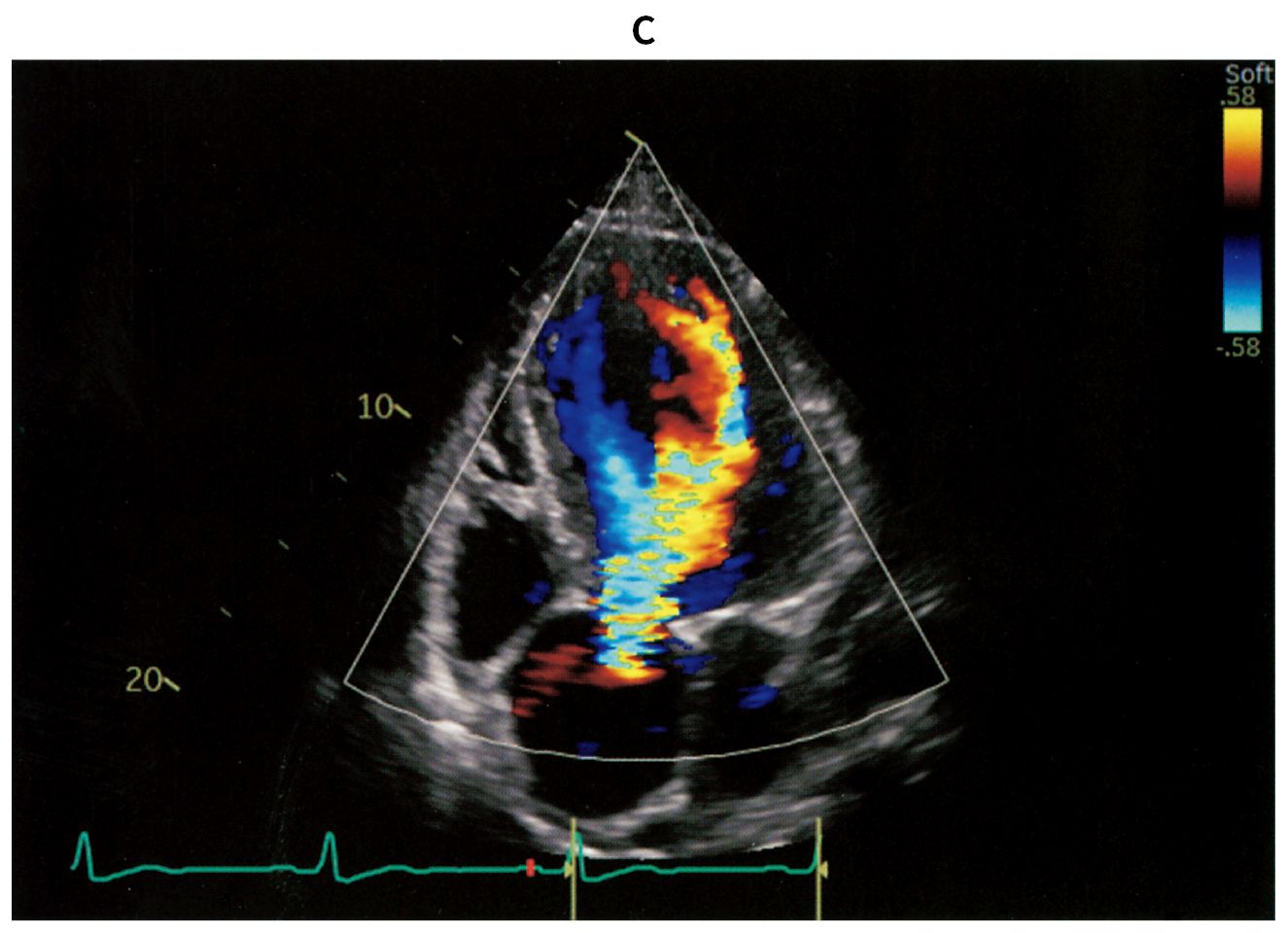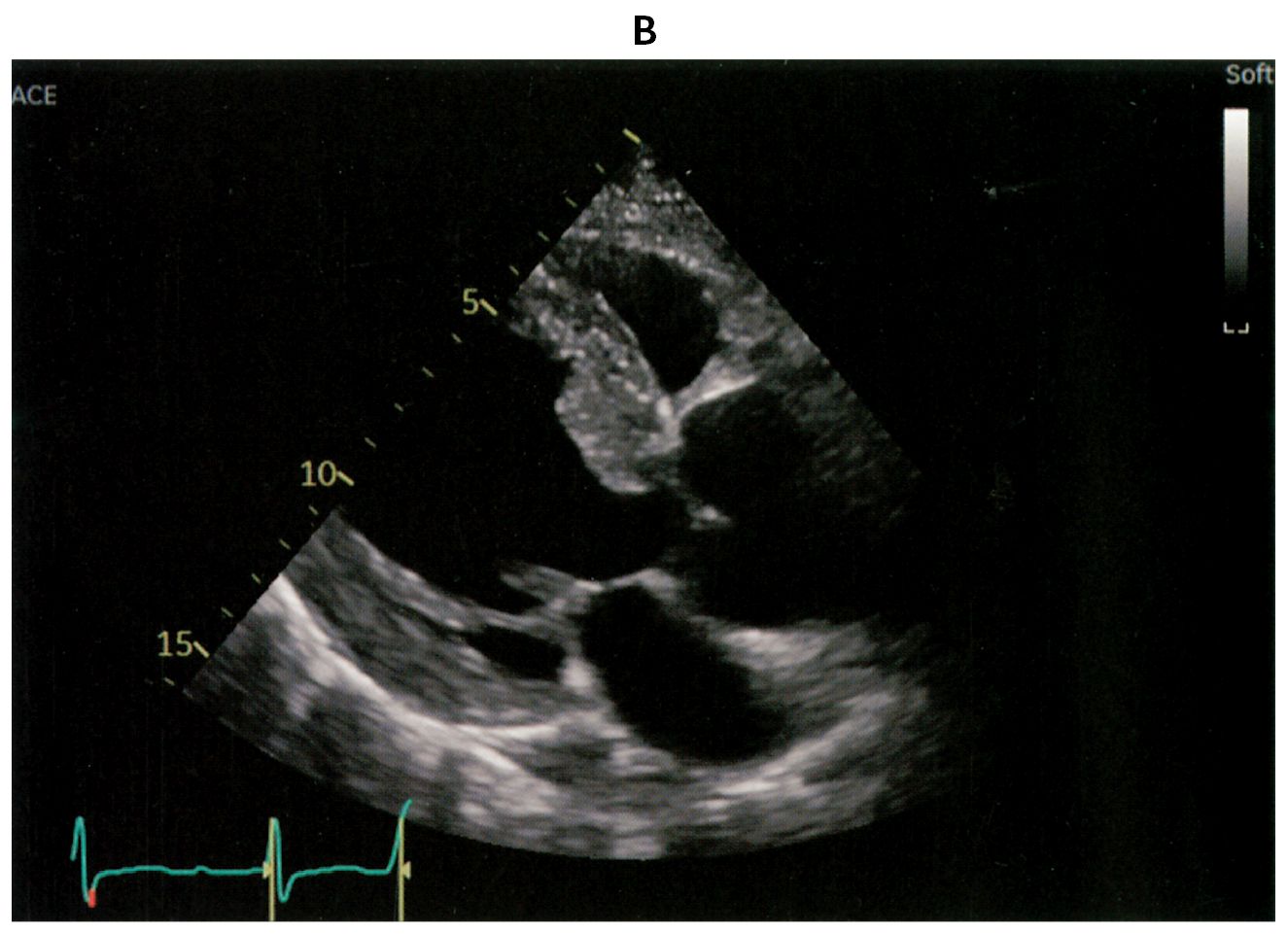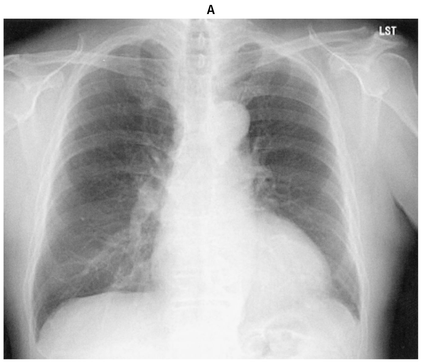 76歳の男性。定期受診で来院した。3年前に拡張期心雑音を指摘され,定期的に心エコー検査で経過観察をしてきた。今回,6か月ぶりの心エコー検査と定期外来で受診し,労作時の息切れを認めた。意識は清明。身長168cm,体重72kg。体温35.8℃。脈拍72/分,整。血圧142/46mmHg。SpO2 98%(room air)。頸静脈の怒張を認めず,呼吸音に異常を認めない。胸骨左縁第3~4肋間にLevine 2/6の拡張期雑音を認める。腹部は平坦,軟で,肝・脾を触知しない。四肢に浮腫を認めない。血液生化学所見:尿素窒素14mg/dL,クレアチニン0.8mg/dL,血糖106mg/dL,HbA1c 6.4%(基準4.9~6.0),BNP 245pg/mL(基準18.4以下)。胸部エックス線写真(A)を示す。心電図では,V4~V6胸部誘導で高電位を認める。心エコー図(B)とカラードプラ心エコー図(C)とを下に示す。心エコー検査では,左室拡張期径69mm,左室駆出率46%,大動脈弁輪の拡大と重症の大動脈弁閉鎖不全症を認める。胸部造影CTでも,著明な大動脈弁基部の拡張を認める。冠動脈造影検査で冠動脈に病変を認めなかった。