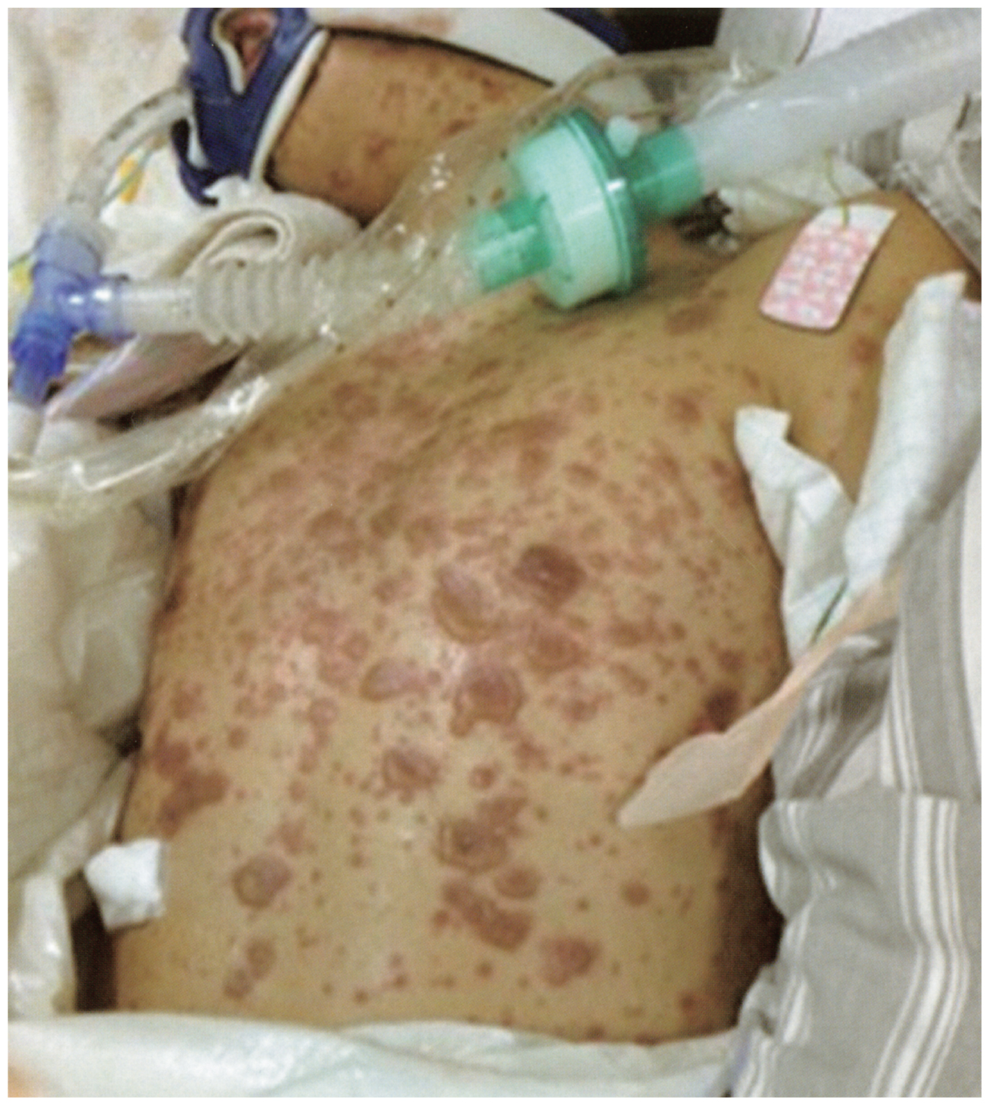 14歳の男子。発熱と皮疹を主訴に来院した。5日前から咽頭痛が出現し,市販のNSAIDを内服している。3日前から発熱と皮疹が出現し,咽頭痛が増強したため受診した。体温39.8℃。両側眼球結膜の充血,口腔粘膜に発赤や出血斑を認める。顔面,体幹の広範囲に紅斑,水疱,びらんを認める。病変部の疼痛が強いため,鎮静下に呼吸管理を開始した。血液所見:赤血球390万,Hb 12.5g/dL,Ht 33%,白血球12,200,血小板25万。血液生化学所見:総蛋白6.4g/dL,アルブミン3.6g/dL,AST 124U/L,ALT 250U/L,LD 480U/L(基準124~222),尿素窒素6.0mg/dL,クレアチニン0.8mg/dL。CRP 13mg/dL。胸部の写真を下に示す。