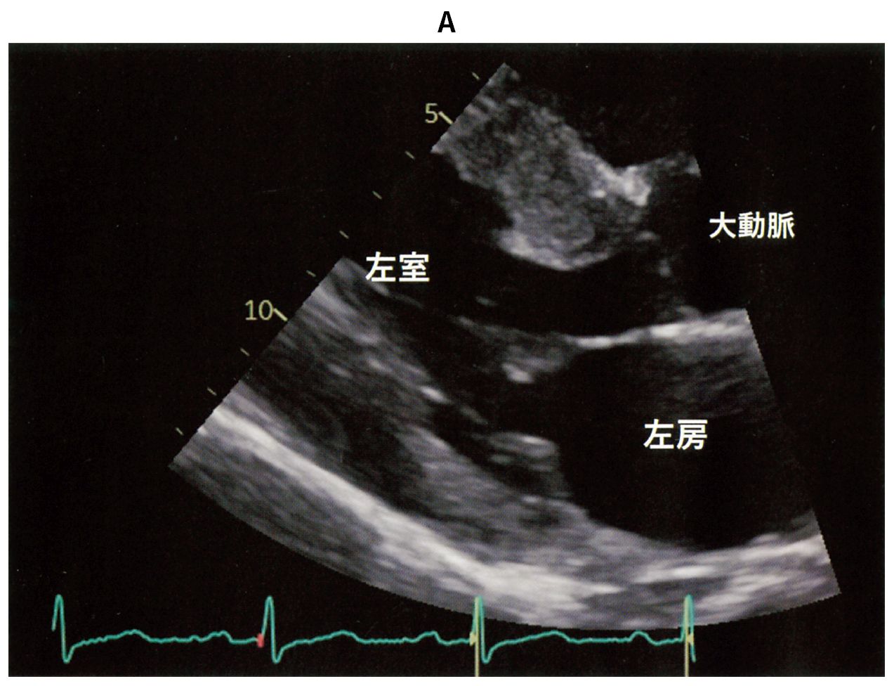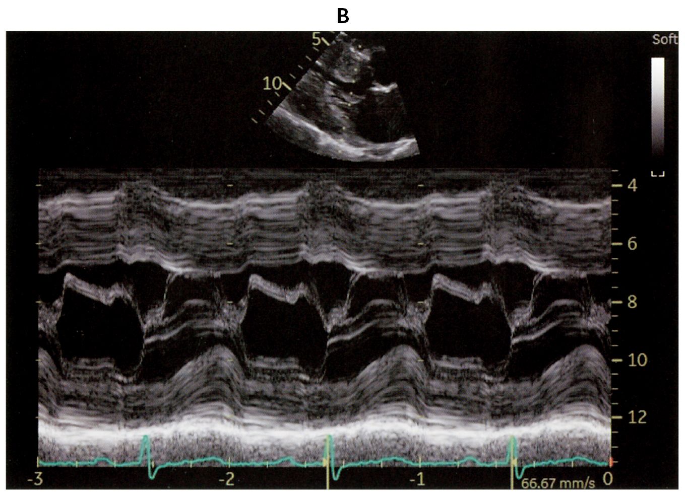 54歳の男性。労作時の息切れを主訴に来院した。以前から心電図異常を指摘されていたが精査は受けていなかった。身長172cm,体重64kg。体温36.5℃。脈拍72/分,整。血圧130/80mmHg。呼吸数18/分。頸静脈の怒張は認めない。胸骨左縁第4肋間を中心にLevine 4/6の収縮期雑音とⅣ音を聴取する。呼吸音に異常を認めない。腹部は平坦,軟で,肝・脾を触知しない。下肢に浮腫を認めない。心エコー検査の傍胸骨長軸像(A)とMモード(B)とを下に示す。