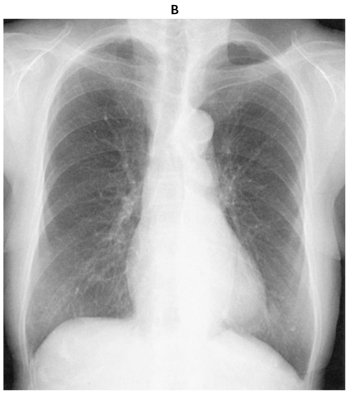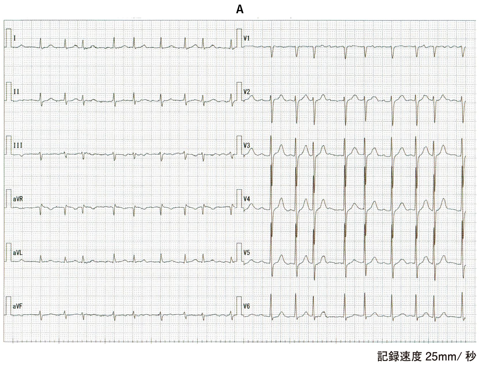 78歳の女性。動悸を主訴に来院した。高血圧で治療中である。1か月前から週に1回程度,誘引なく動悸症状があるが数分で改善していた。3日前から動悸症状が持続している。日常生活には支障はないが,症状が持続するため受診した。意識は清明。身長156cm,体重45kg。脈拍116/分,不整。血圧108/68mmHg。SpO2 98%(room air)。心音と呼吸音とに異常を認めない。心エコー検査では左室壁運動は良好に保たれている。12誘導心電図(A)と胸部エックス線写真(B)とを下に示す。