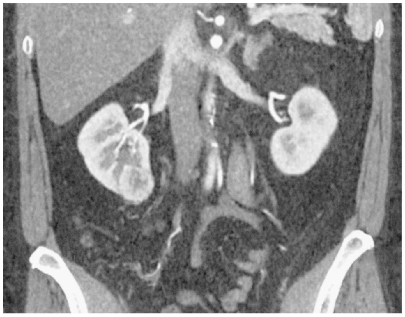 60歳の男性。3週間前に受けた人間ドックの腹部超音波検査で右腎下極に径2.5cmの腫瘤を指摘されたため来院した。自覚症状はない。尿所見:蛋白(-),糖(-),潜血(-),沈渣に赤血球,白血球を認めない。血液所見:赤血球474万,Hb 14.9g/dL,Ht 43%,白血球5,900,血小板20万。血液生化学所見:総蛋白7.1g/dL,アルブミン4.1g/dL,総ビリルビン0.9mg/dL,AST 24U/L,ALT 26U/L,LD 156U/L(基準124~222),尿素窒素14mg/dL,クレアチニン1.0mg/dL,Na 138mEq/L,K 4.3mEq/L,Cl 102mEq/L。CRP 0.1mg/dL。腹部造影CTの冠状断像を下に示す。胸腹部CTでは転移を認めない。
