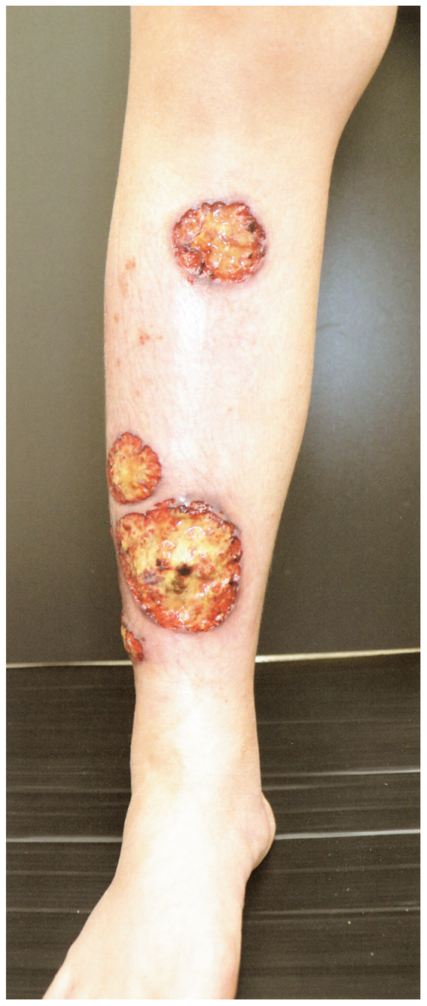 25歳の女性。右下腿の皮疹を主訴に来院した。1週間前に右下腿に小丘疹が出現し,掻破後に急速に潰瘍が拡大した。その後,潰瘍は多発してきた。潰瘍性大腸炎で治療中である。体温36.1℃。下腿は強い疼痛を伴い,潰瘍辺縁は紫紅色調を呈している。潰瘍部の細菌培養は陰性。病変部の病理検査で真皮に好中球の浸潤を多数認めるが,乾酪壊死を伴う類上皮細胞肉芽腫を認めない。右下腿の皮疹の写真を下に示す。