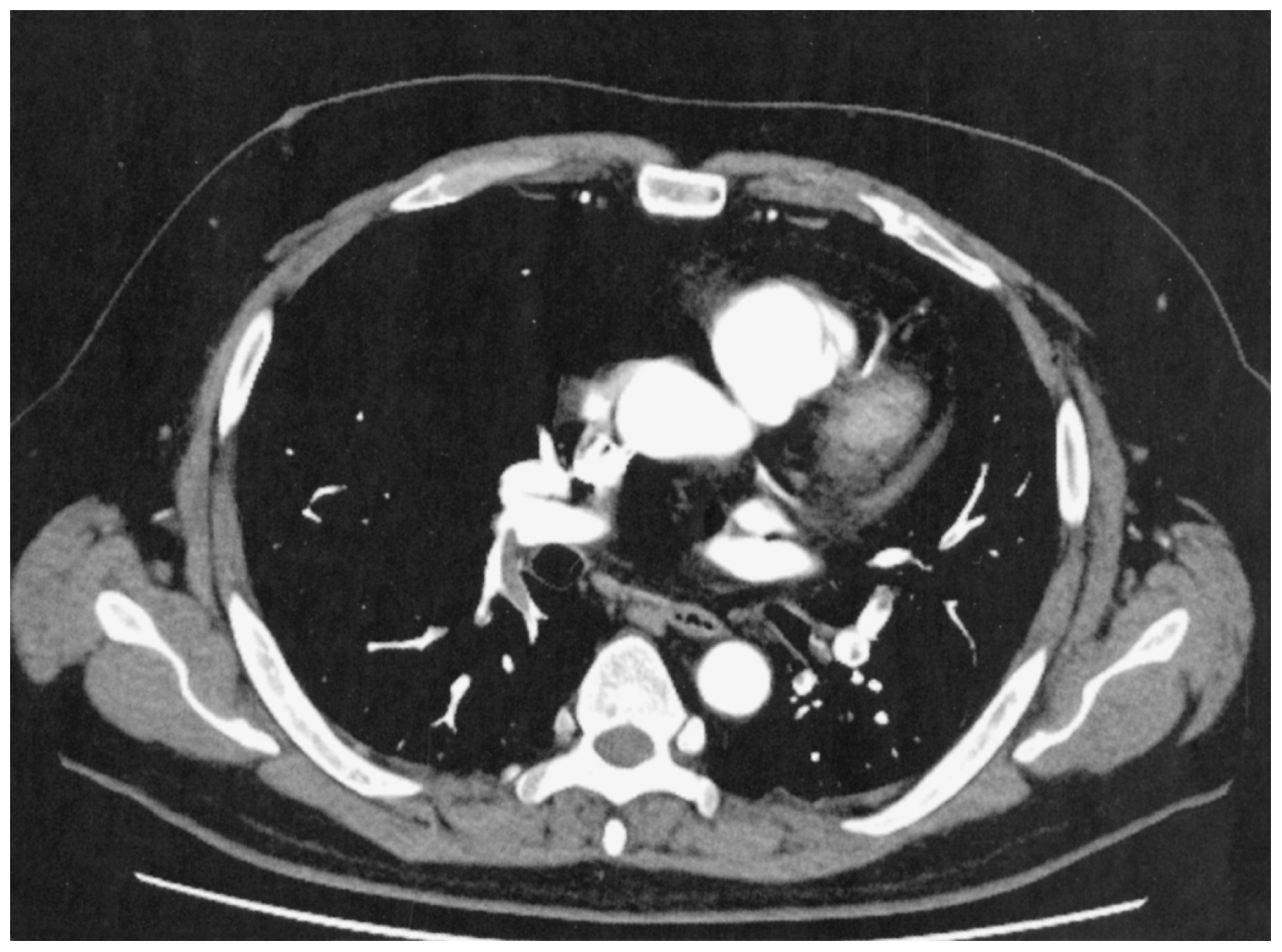 58歳の男性。労作時の呼吸困難を主訴に来院した。今朝,起床後から労作時呼吸困難が出現した。通常通りに出勤したが呼吸困難が持続しており,処方されていた吸入薬を使用後も改善がみられなかったため受診した。35歳時から①喘息に対して吸入療法中。57歳時から②臨床病期Ⅳ期の非小細胞肺癌に対して治療中。③2週間前にインフルエンザワクチン接種を受けた。④築35年の木造住宅に住んでいる。⑤自宅で鳥を飼育している。意識は清明。身長172cm,体重67kg。体温36.5℃。脈拍92/分,整。血圧138/90mmHg。呼吸数20/分。SpO2 92%(room air)。頸静脈の怒張と口唇のチアノーゼとを認めない。心雑音を聴取しないが胸骨左縁第2肋間でⅡ音の亢進を認める。呼吸音に異常を認めない。下腿に浮腫を認めない。血液所見:赤血球452万,Hb 13.8g/dL,Ht 41%,白血球5,400,血小板21万,PT-INR 1.0(基準0.9~1.1),Dダイマー4.4μg/mL(基準1.0以下)。血液生化学所見:総ビリルビン1.0mg/dL,AST 21U/L,ALT 9U/L,LD 306U/L(基準124~222),CK 60 U/L(基準59~248),尿素窒素11mg/dL,クレアチニン0.6mg/dL,血糖114mg/dL。胸部造影CTを下に示す。