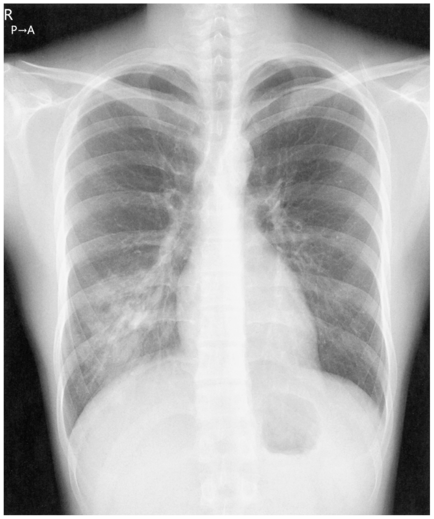 24歳の男性。3日前からの発熱と咳とを主訴に来院した。咳は乾性で頑固である。同様の症状を訴えている会社の同僚がいる。意識は清明。体温38.7℃。脈拍96/分,整。呼吸数20/分。呼吸音に異常を認めない。皮膚と口腔粘膜とに脱水所見は認めない。血液所見:白血球6,800(桿状核好中球9%,分葉核好中球55%,好酸球2%,単球6%,リンパ球28%)。CRP 7.8mg/dL。インフルエンザウイルス及び新型コロナウイルス〈SARS-CoV-2〉の抗原検査は陰性であった。誘発喀痰のGram染色や尿中抗原検査では原因菌は推定できなかった。胸部エックス線写真を下に示す。