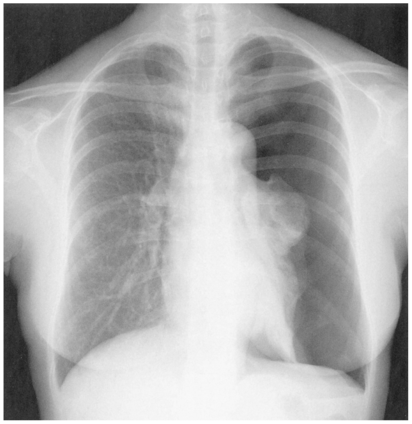 40歳の女性。突然の胸痛と呼吸困難を主訴に救急車で搬入された。意識レベルはJCSⅡ-10。身長168cm,体重60kg。体温36.9℃。心拍数120/分,整。血圧80/60mmHg。呼吸数30/分。SpO2 91%(リザーバー付マスク10L/分 酸素投与下)。毛細血管再充満時間3秒。皮膚はチアノーゼを認める。眼瞼結膜に貧血を認めない。頸静脈の怒張を認める。呼吸音は左前胸部で消失し,打診で左胸部に鼓音を認める。胸部エックス線写真を下に示す。