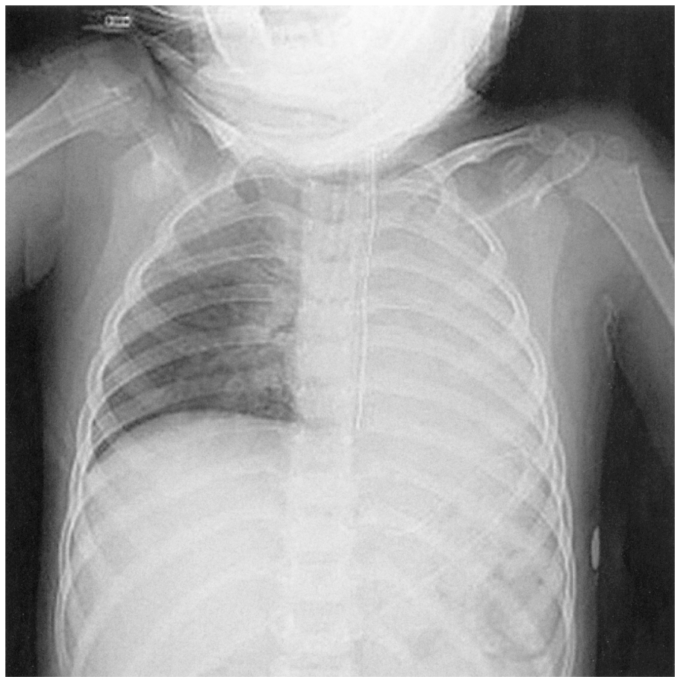 4歳の女児。急性脳症による意識障害のため小児集中治療室〈PICU〉で人工呼吸管理中である。今朝,SpO2が突然低下したため,研修医に報告があった。体温37.0℃。心拍数130/分,整。血圧92/50mmHg。呼吸数30/分(呼吸器設定:換気回数30/分,FIO2 0.4)。SpO2 81%。胸郭の動きは左右差がある。心音に異常を認めない。呼吸音は左側で著明に減弱している。腹部は平坦,軟で,腸雑音を聴取する。経鼻胃管は昨日と同じ固定位置で,胃液が吸引できる。気管チューブの固定テープにゆるみがあり,固定位置が2cm深くなっている。気管チューブから喀痰吸引を行い,チューブの閉塞はみられなかった。胸部エックス線写真を下に示す。