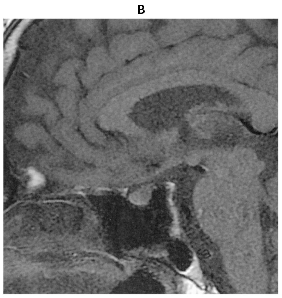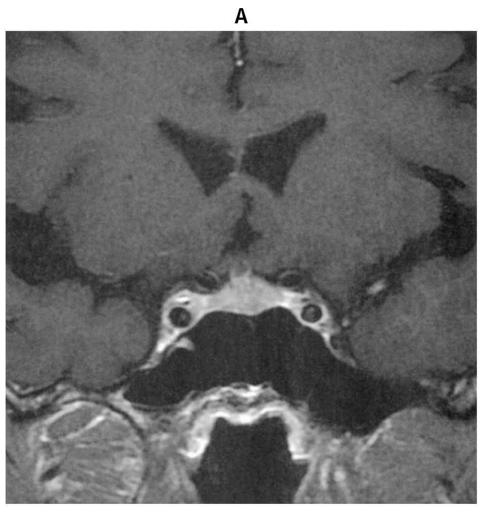 55歳の男性。口渇,多飲および多尿を主訴に来院した。尿量6~8L/日と著明な多尿が数週間続いている。口腔内は乾燥している。尿所見:蛋白(-),糖(-)。頭部造影MRIのT1強調冠状断像(A)と頭部単純MRIのT1強調矢状断像(B)とを下に示す。